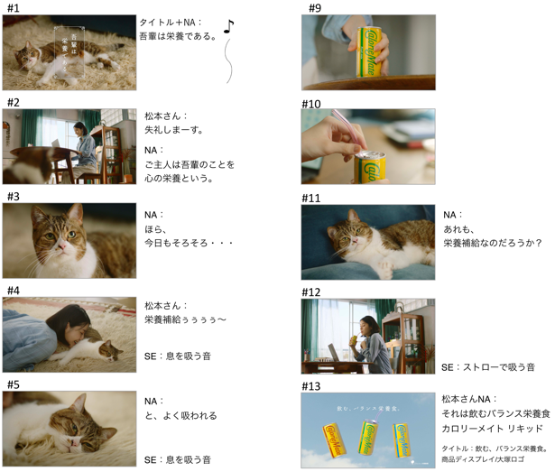 本CMは、主人公とともに暮らす猫の視点で展開します。「吾輩は栄養である」と、語り始めた猫が主人公の女性に目をやると、丁度リモート会議が終わった様子。「ふぅ」と一息ついた後、「栄養補給ぅぅぅぅ~」と言いながら床に寝そべる猫に癒されます。そんな主人公が、オンライン会議をしながら補給するのは猫ではなく、黄色いドリンク「カロリーメイト リキッド」。 カロリーメイト リキッドをストローで飲みながら栄養補給をする主人を見て、猫も安心した表情を浮かべます。「人間には、いろんな栄養が必要だ」――そんな達観した猫の台詞で締めくくる本作は、こころの栄養を愛猫で、からだの栄養をカロリーメイト リキッドで上手く補完しながら仕事を頑張る女性の日常が爽やかに描かれています。
