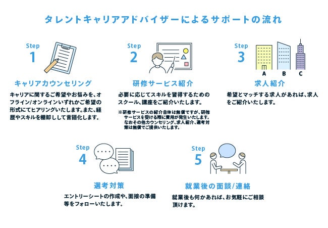 ※2 研修サービスの紹介自体は無償ですが、研修サービスを受ける際には費用が発生いたします。なおその他カウンセリング、求人紹介、選考対策は無償でご提供いたします。