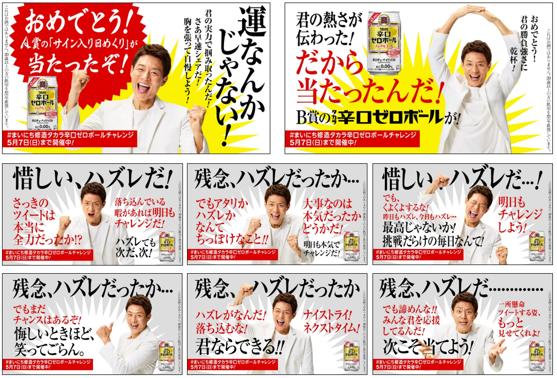 また、Twitterで「#まいにち修造 タカラ辛口ゼロボールチャレンジ キャンペーン」を展開しており、毎日当選者が発生するこのキャンペーンは、応募したその場で結果がわかるスリル感を楽しんでいただける上、外れても修造さんのメッセージに励まされて、なぜか元気がもらえる。明日も違うメッセージを見たい!など、様々な声をいただいております。