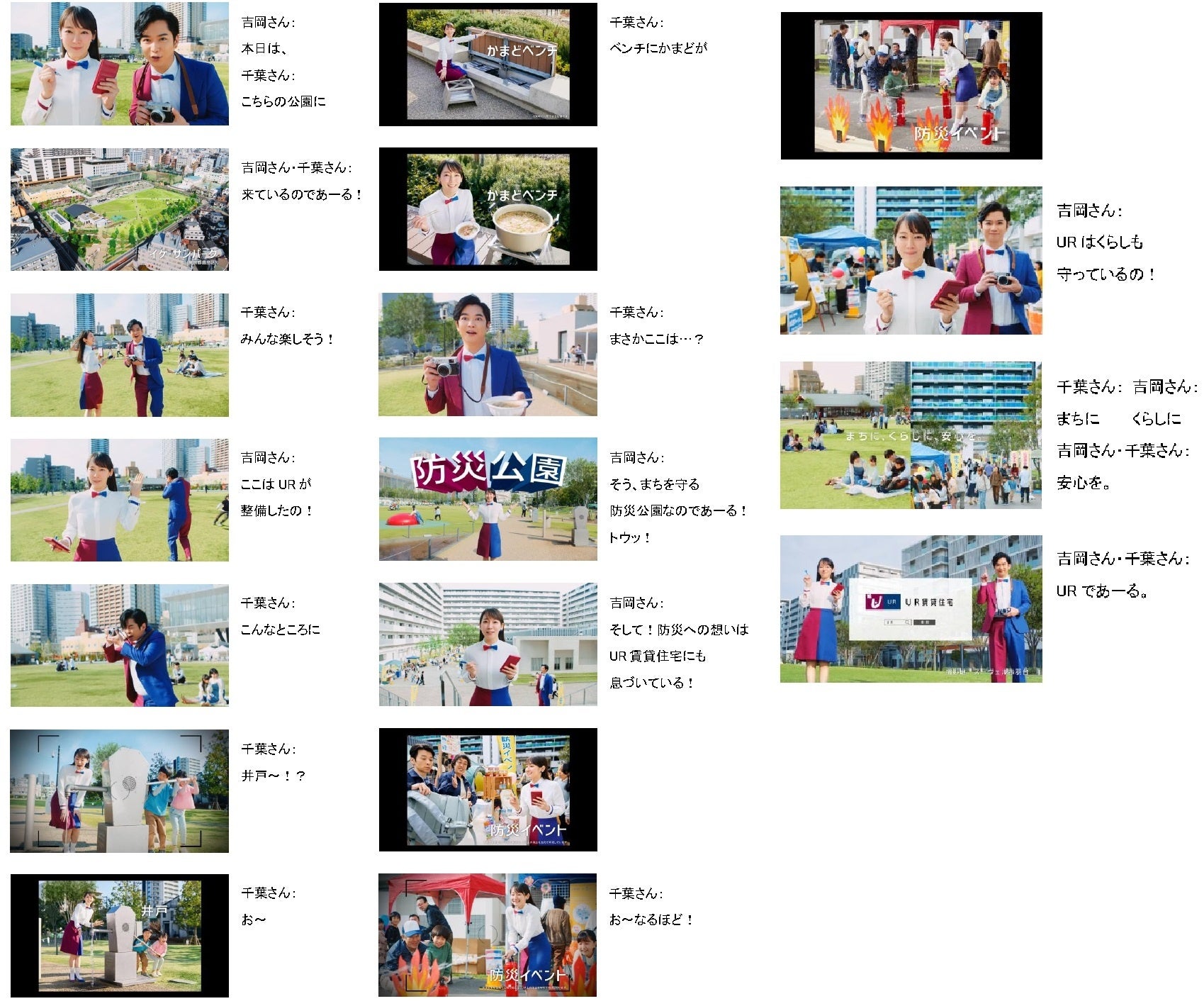 東京都豊島区内のとある公園に取材にやってきた、記者役の吉岡さんと撮影担当の千葉さん。「本日はこちらの公園にやってきたのであーる!」という2人の元気なセリフでCMはスタートします。上空からドローンで撮影された広々とした公園の全景に続き、シーンは公園で遊ぶ子どもたちへ。千葉さんが「みんな楽しそう!」とテンションを上げると、「ここはURが整備したの!」と吉岡さんが説明します。公園に設置されている井戸や、ベンチに収納されているかまどを見つけた千葉さんが「こんなところに井戸!?」「ベンチにかまどが!?」と驚き、「まさかここは…?」と何かを察すると、吉岡さんが「そう、まちを守る防災公園なのであーる!」と答えます。