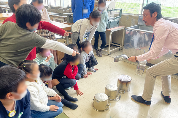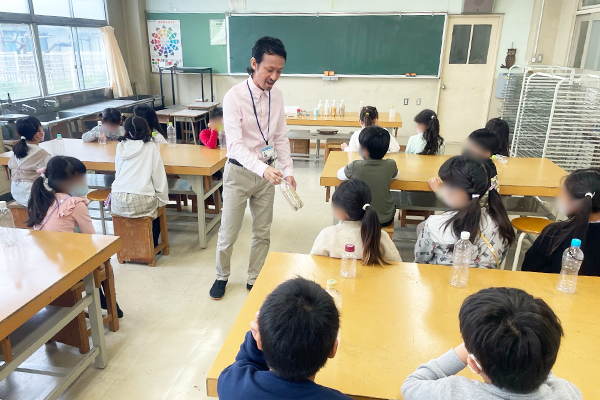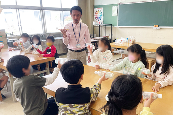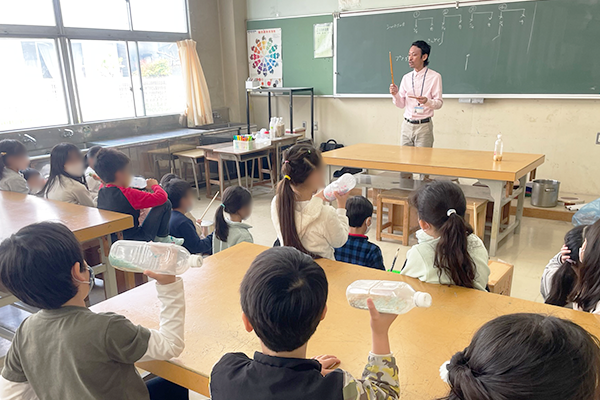 弊社が運営する音楽教室のドラム学科 「ドラム義塾」の創立者であ る西が、空きペットボトルを使ったマラカス作りを指導。空きペット ボトルの中に砂や小石、お米やポップコーンの粒などを入れて作った「手作りマラカス」でマラカスの振り方を練習。全員で息を合わせ てリズムを奏でました。