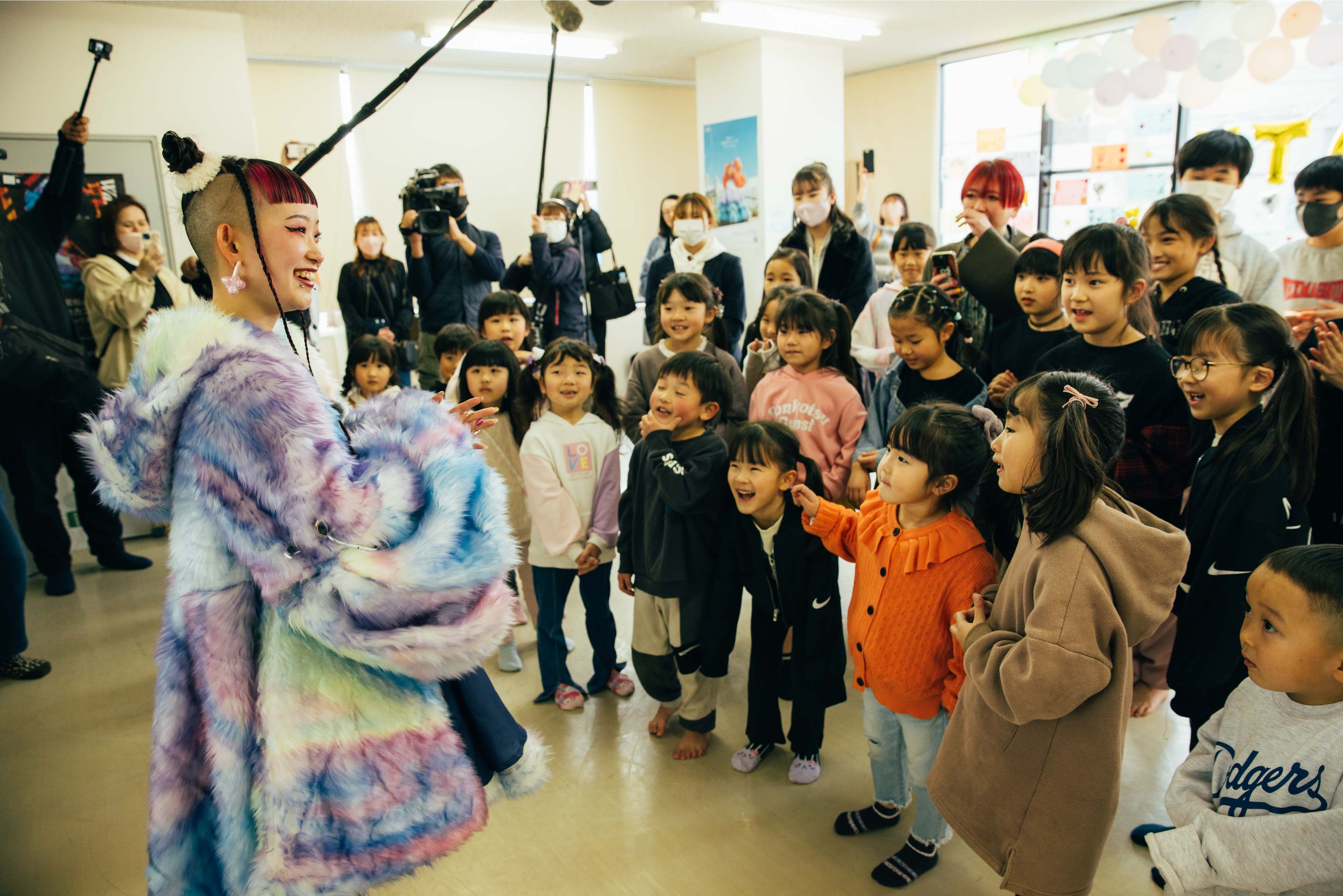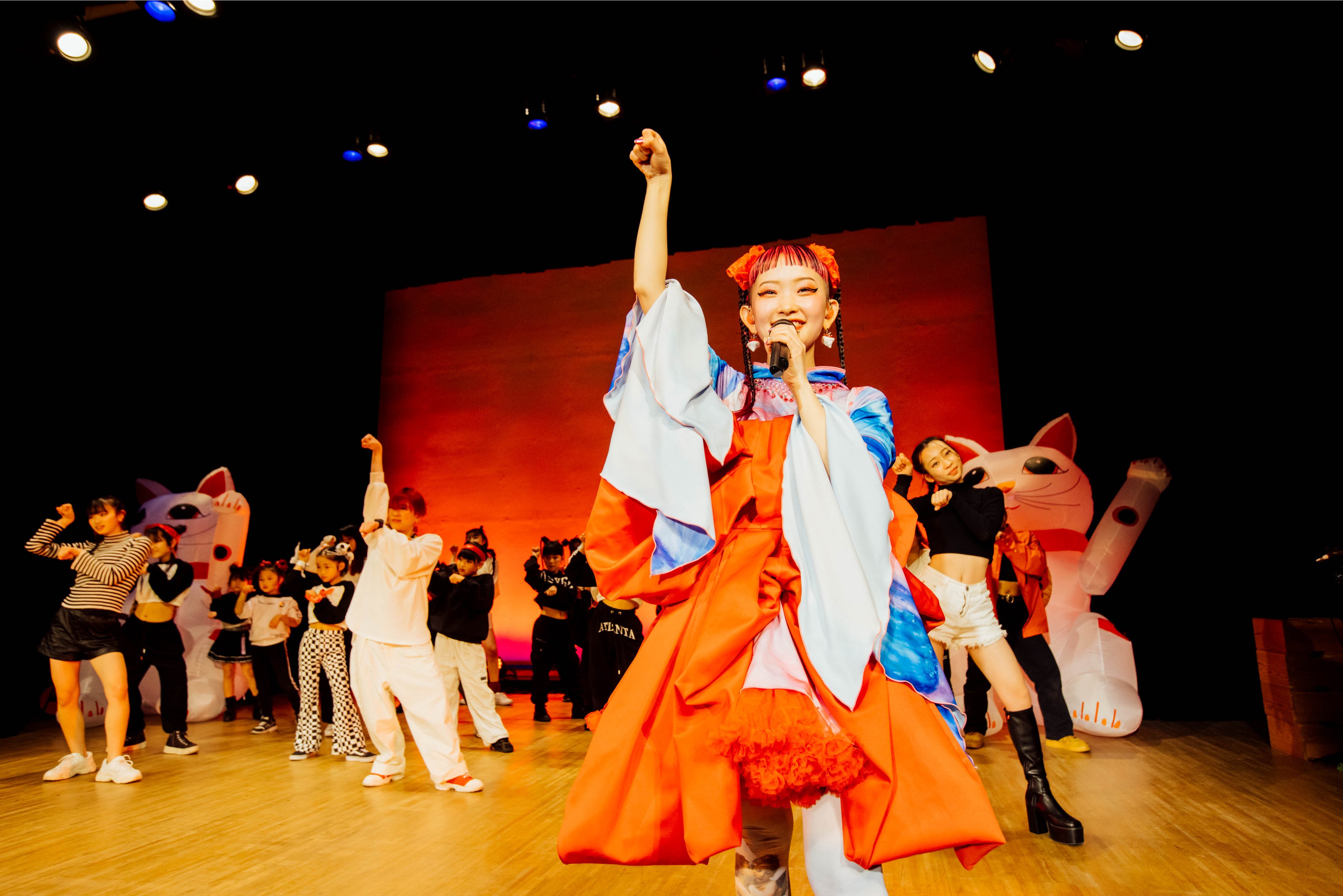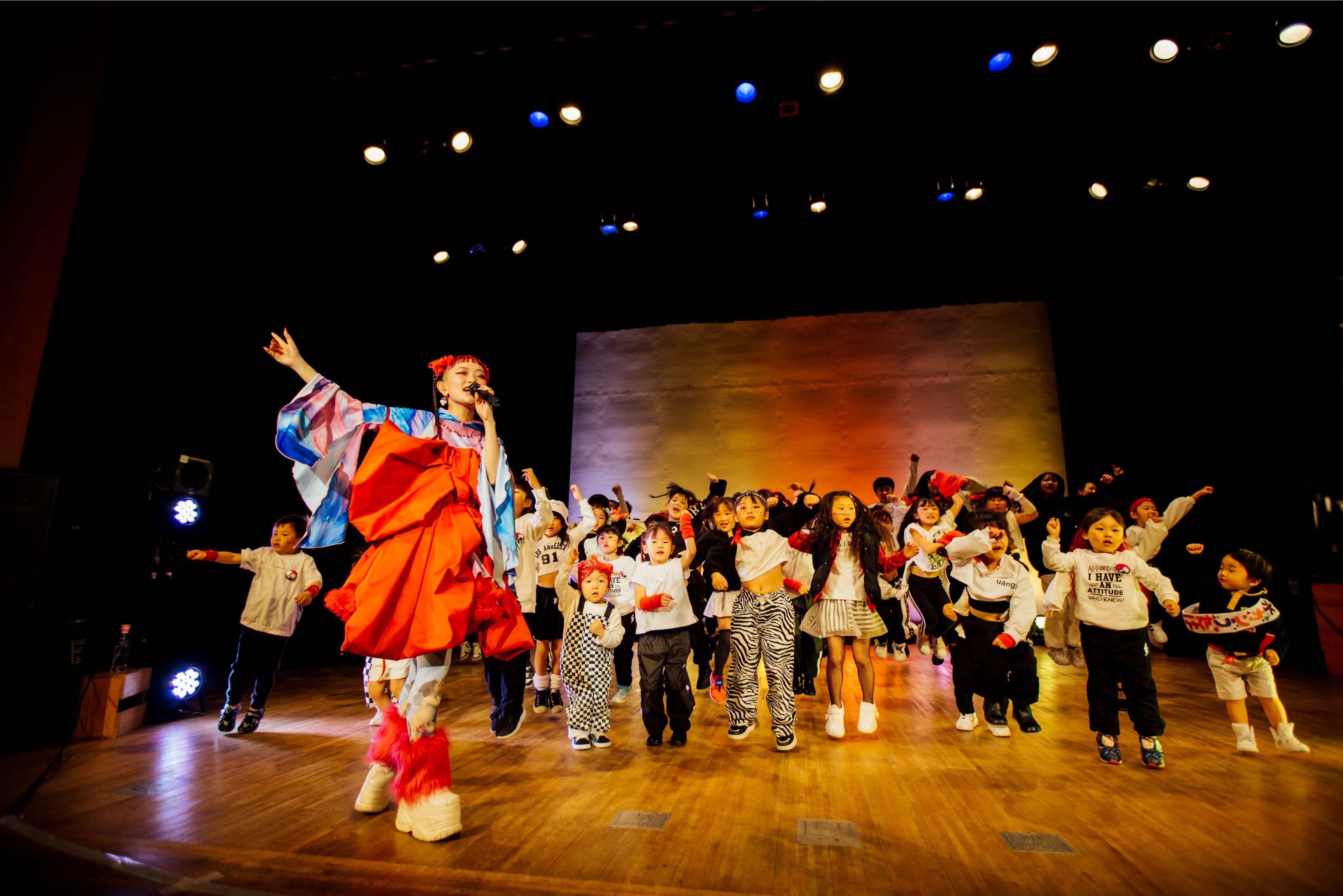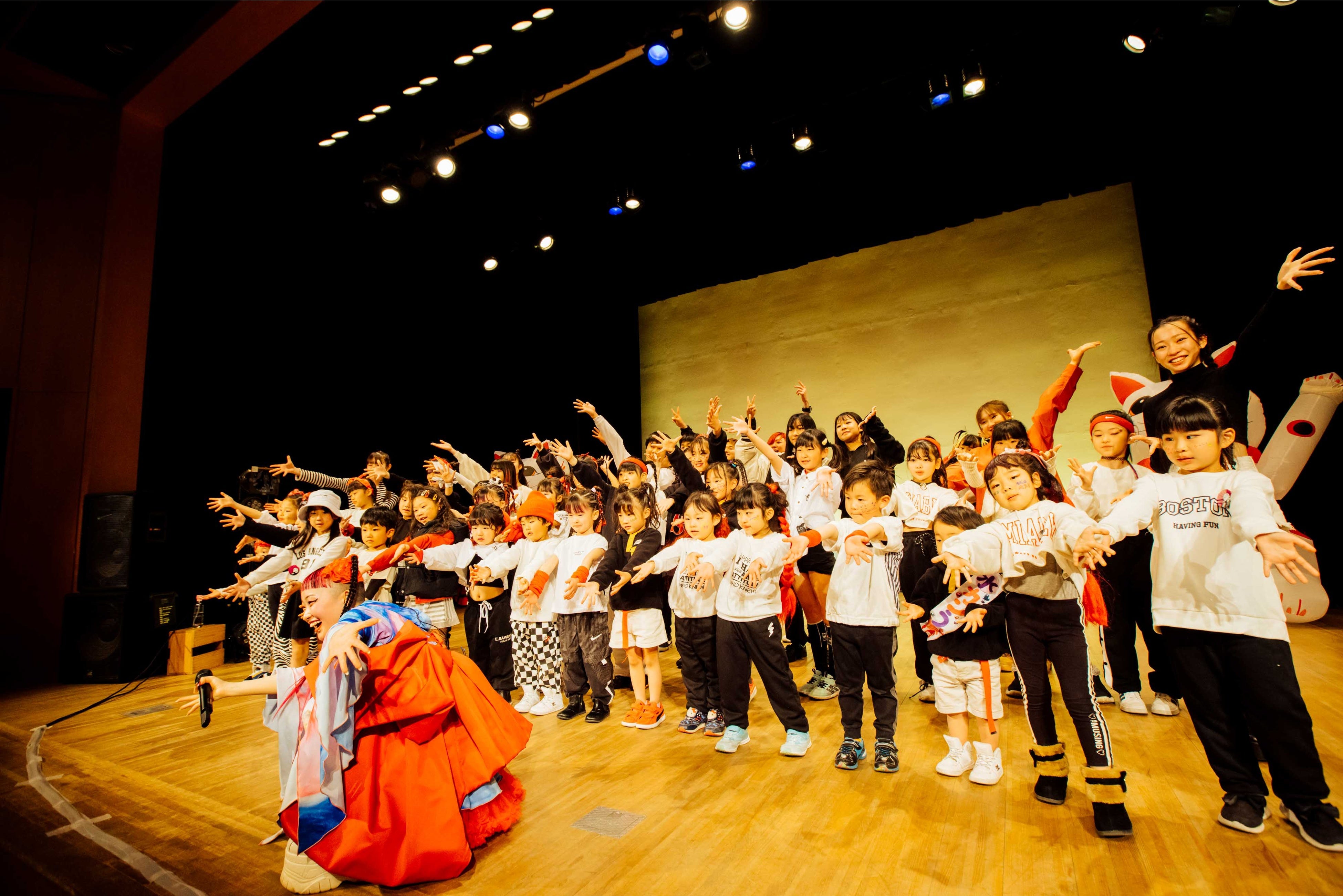 3/5(日)に『若松市民会館』で開催された、若松の未来について考えるシンポジウム「若松の日曜日」。前半は、若松在住の4名のパネラーと参加者が意見を交えながら、”あなたが考える若松の未来”についてトークセッション。「キラキラしたまちになってほしい」という微笑ましい期待から、「名所を活用したイベントを求む!」というその土地をよく知る人だからこそ生まれるアイデアなど、幅広い世代の声が一つの場所で混じり合い、街の未来に明るい希望を育みました。後半では、いよいよスペシャルゲストの水曜日のカンパネラが登場。詩羽さんのソロステージに続いて、「やな3crew」のキッズダンサーたちとのコラボパフォーマンスが3曲披露され、会場の盛り上がりも最高潮!総勢30名以上のキッズダンサーたちが見せる、時に可愛らしく、特に真剣な表情に、詩羽さんをはじめその場の全員が大成功!と口を揃えた、大満足のステージとなりました。