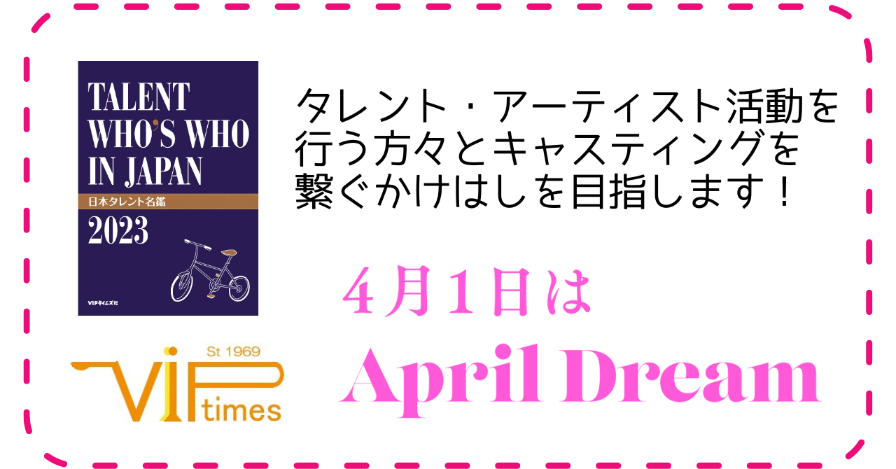当社は、4月1日を夢を発信する日にしようとするApril Dreamに賛同しています。このプレスリリースは「日本タレント名鑑」を運営しているVIPタイムズ社の夢です。