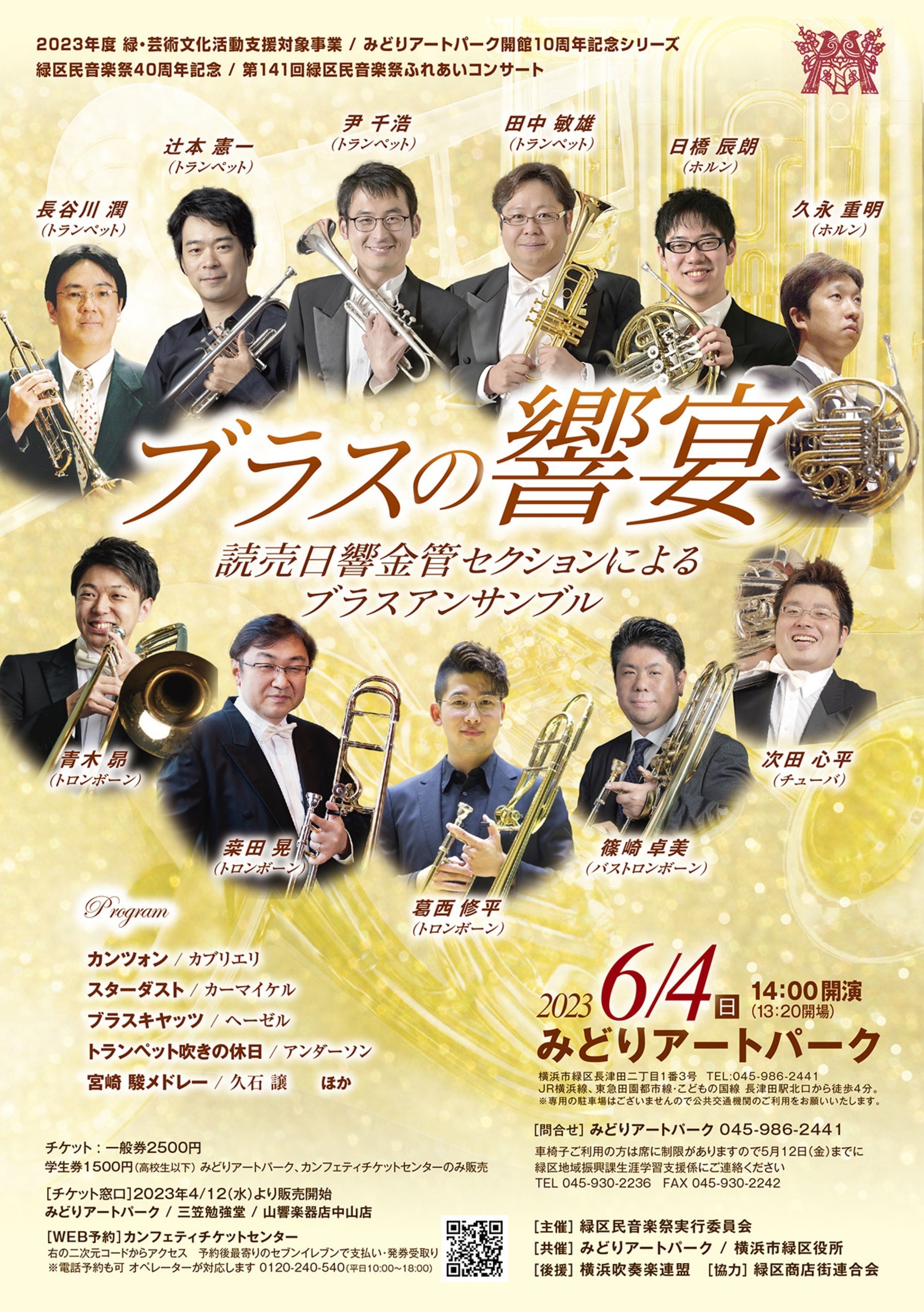 読売日本響楽団金管奏者11名による重厚なブラスアンサンブルの響きに魂が揺さぶられます! 緑区民音楽祭実行委員会40周年記念となる第141回ふれあいコンサートが6月4日(日)みどりアートパークにて開催(開演14時)。