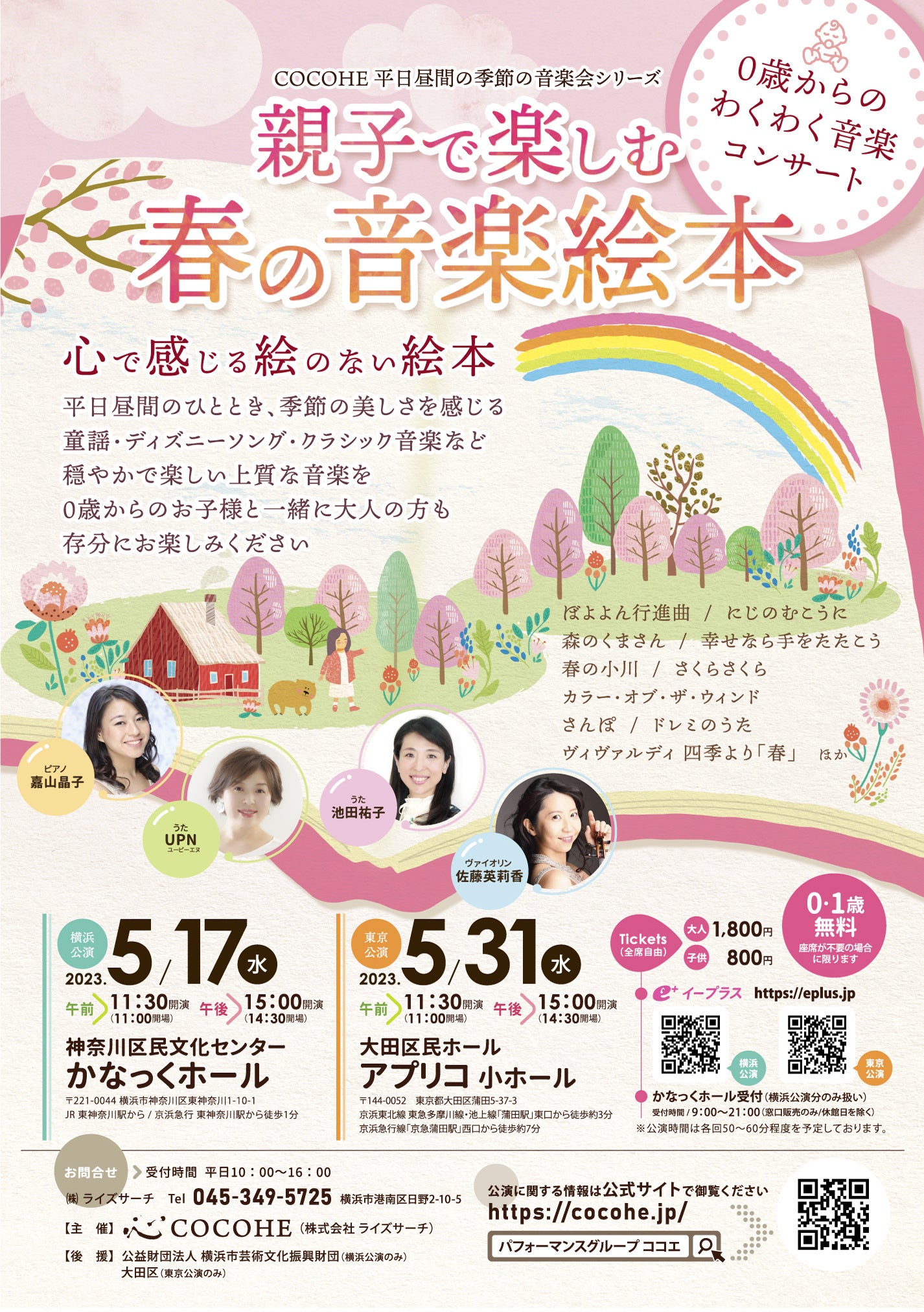 株式会社ライズサーチ(代表取締役 内田奈津子 横浜市港南区)は、当社が運営するパフォーマンスグループCOCOHEの新シーズンを2023年5月17日(水)の神奈川区民文化センターかなっくホールにて上演する「0歳からのわくわく音楽コンサート 春の音楽絵本」を皮切りにスタートさせます。