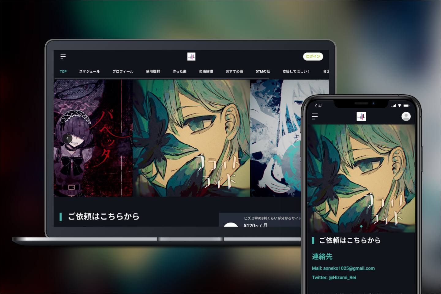 楽曲の制作依頼やこれまでのディスコグラフィーのほか、有料会員にご登録いただくとヒズミ零本人による楽曲解説や機材紹介などの記事コンテンツ、本人も登場するグループチャット、MVへのクレジット掲載などのスペシャルなコンテンツをお楽しみいただけます。当サイトの詳細は、下記URLよりご確認ください。