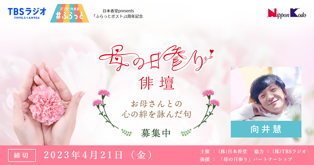 投句は、「母の日」または「母の日参り」をお題とした未発表・オリジナルの俳句作品を同社公式サイト内の特設フォーム(https://www.nipponkodo.co.jp/campaign/hahanohimairi-haidan/)にて、4月21日(金)まで受け付けています。入賞作品4句は、5月の「母の日」前のTBSラジオ「パンサー向井の#ふらっと」内のコーナー「ふらっとポスト」で、向井さんの朗読により発表いたします。発表当日の番組では、フルーツポンチ 村上健志さんをゲストにお迎えし、作品談義に花を咲かせていただく予定です。