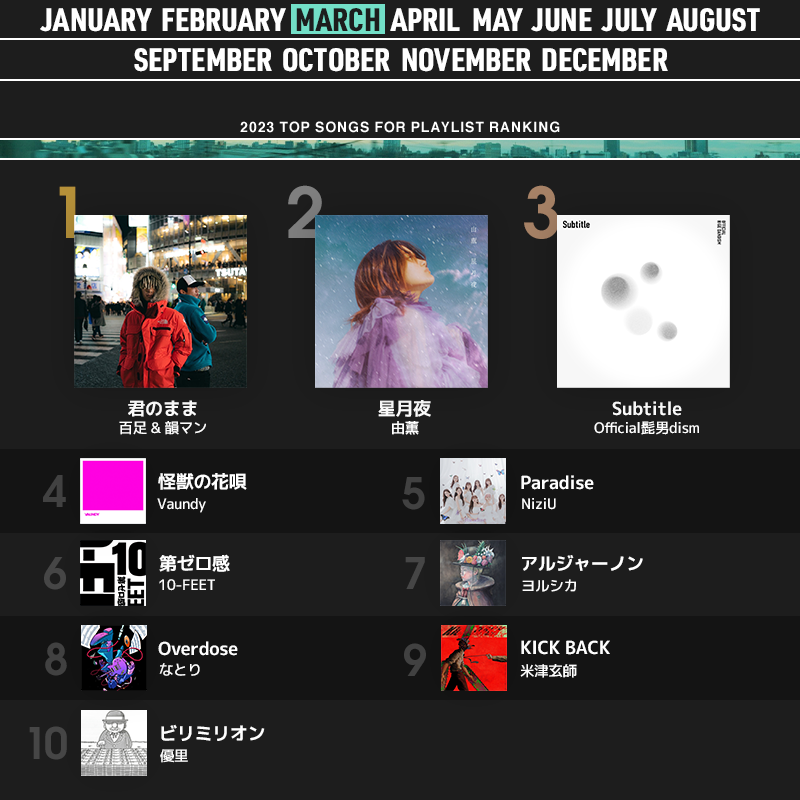 2023年3月度は、第15回高校生RAP選手権で優勝を果たした百足と、若者から急速に支持を集めるラッパーの韻マンのコラボ楽曲「君のまま」が初の1位を獲得しました。2位には、テレビ朝日系ドラマ『星降る夜に』主題歌の由薫「星月夜」ランクイン。『映画ドラえもん のび太と空の理想郷(ユートピア)』主題歌に起用されたNiziUの「Paradise」が初登場で5位にランクインしています。その他にも、3月29日にリリースした優里の2ndアルバム『弐』に収録の「ビリミリオン」が10位にランクインするなど、話題の楽曲が目白押しです。ぜひ、この続きはランキング50位までを発表しているプレイリストでお楽しみください。