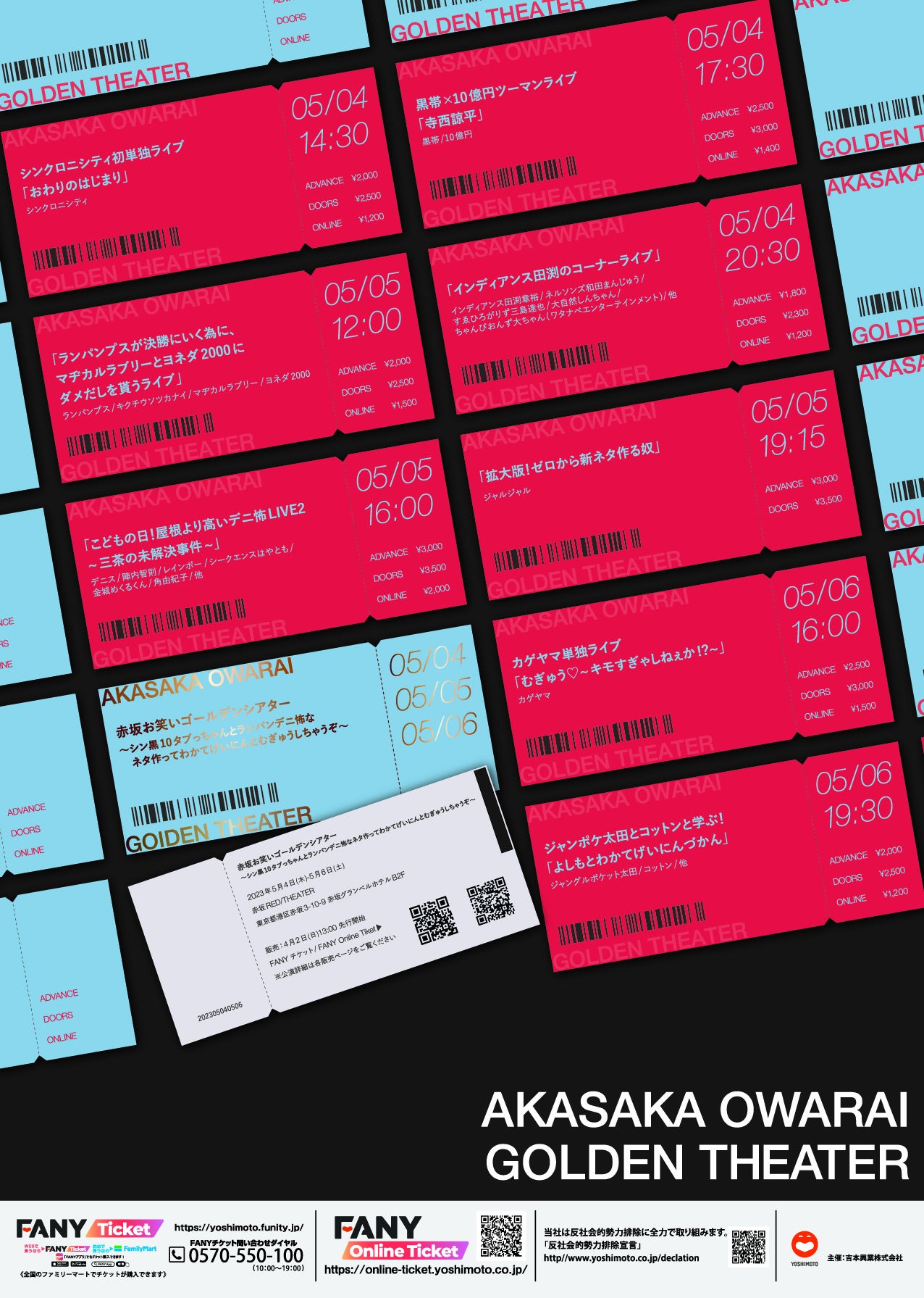 この度、「赤坂RED/THEATER」にて、5月4日(木)~5月6日(土)に『赤坂お笑いゴールデンシアター』と題してさまざまな企画ライブを3日間連続、合計8公演実施致します!現在、会場チケット先行販売中となります。