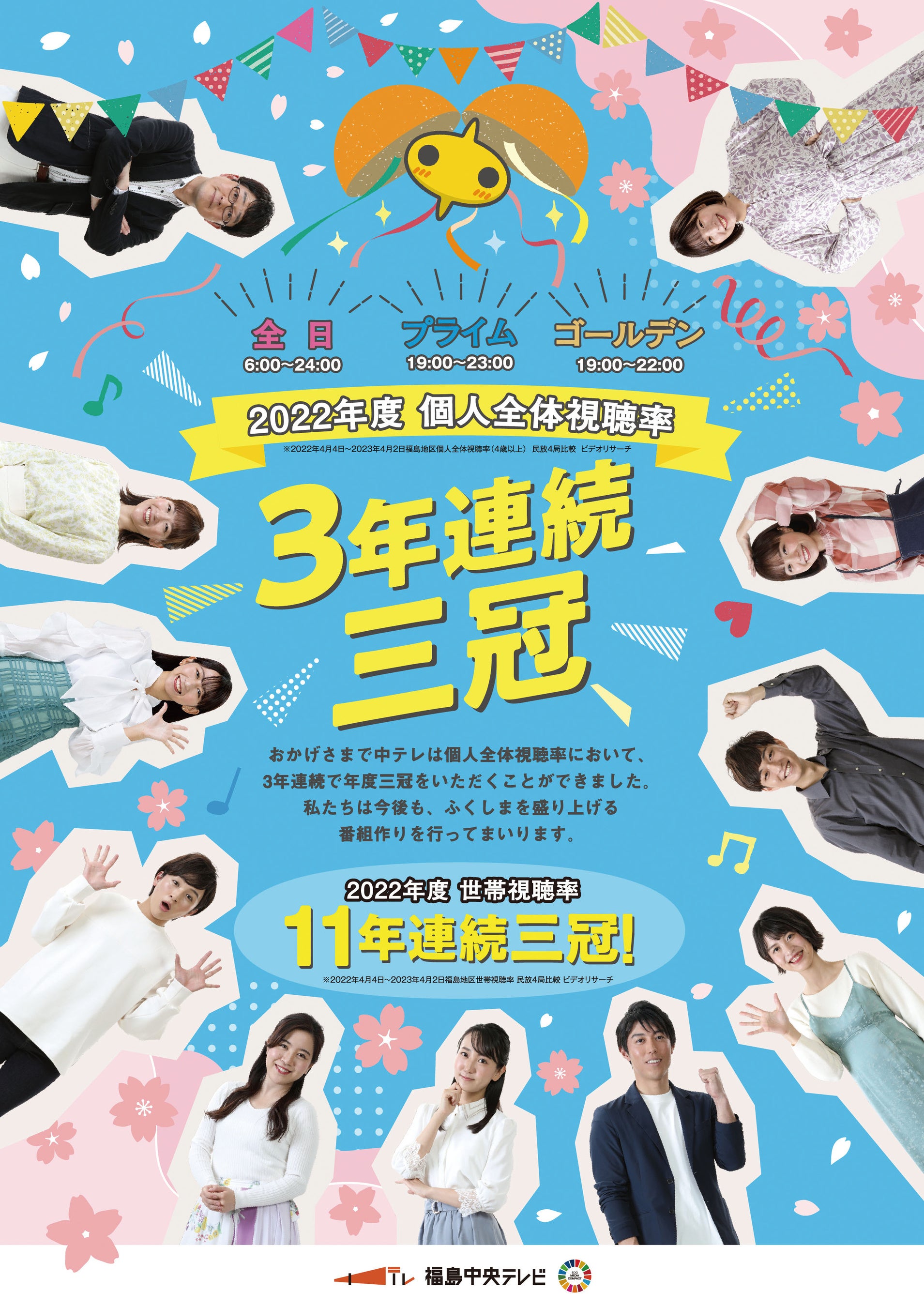 それによると、福島地区では福島中央テレビ(日本テレビ系列・中テレ)が、世帯視聴率において、全日(6時~24時)7.8%、ゴールデン(19~22時)13.6%、プライム(19~23時)12.6%で、3つの時間帯すべてで1位となり、年度の視聴率三冠を獲得した。福島中央テレビの年度世帯視聴率での三冠は県内民放4局比較で11年連続となる。