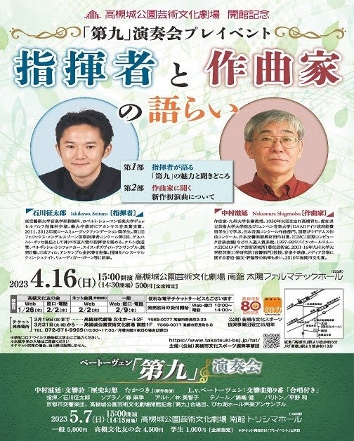 令和5年5月7日に高槻城公園芸術文化劇場で開催される「第九」演奏会を前に、当日指揮者を務める石川征太郎さんと、本演奏会が世界初演となる交響詩「歴史幻想 たかつき」を作曲した中村滋延さんが、聴きどころ・見どころについて対談を行います。本公演がより楽しくなるプレイベントです。本公演と併せてぜひお越しください。