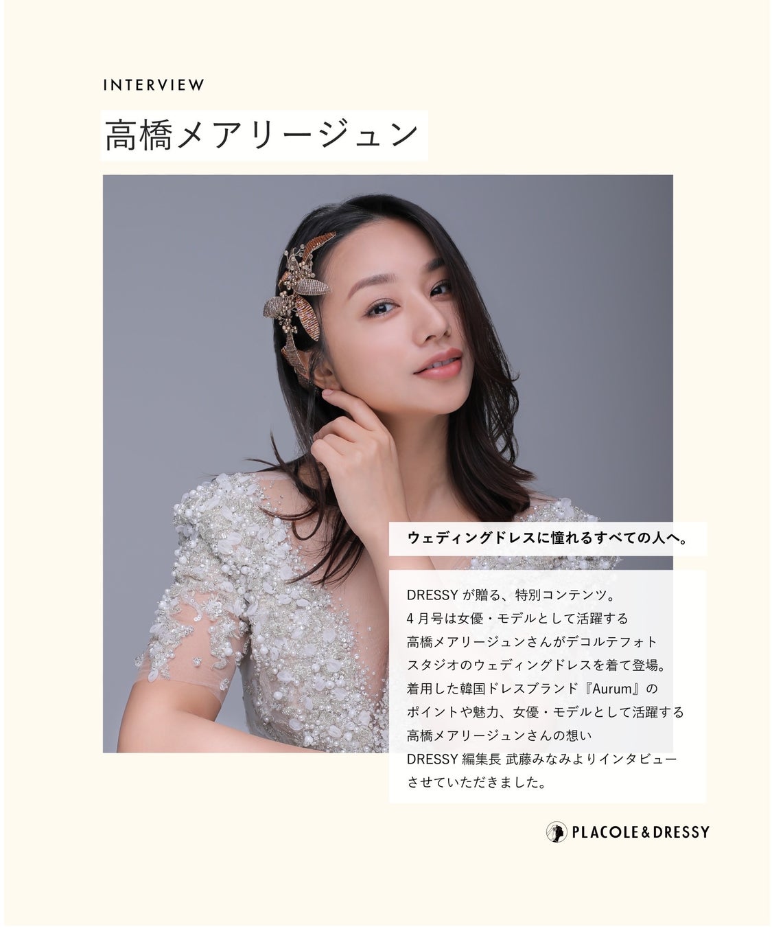 4月号は女優・モデルとして活躍する高橋メアリージュンさんがデコルテフォトスタジオのウェディングドレスを着て登場。着用した韓国ドレスブランド『Aurum』のポイントや魅力、女優・モデルとして活躍する高橋メアリージュンさんの想いをDRESSY編集長 武藤みなみよりインタビューさせていただきました。