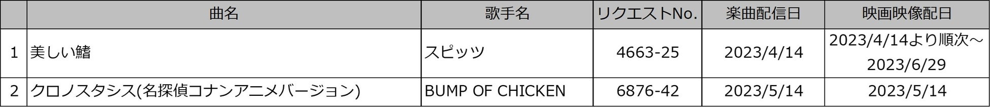 | ①劇場版最新作『名探偵コナン 黒鉄の魚影』の主題歌・スピッツの「美しい鰭」に期間限定で映画映像を配信*。 【4月14日~6月29日】 併せて、昨年公開の劇場版『名探偵コナン ハロウィンの花嫁』の主題歌・BUMP OF CHICKENの「クロノタシス」も映画映像で配信*。【5月14日】 ②リクエストコマンダー・デンモク(SmartDAMシリーズ)から歴代の映画主題歌26曲を対象に予約した際に表示されるQRコードより、必要項目を入力して応募した方の中から抽選で、4種類のコナングッズを計100名様にプレゼント。 ③映画登場キャラクターをイメージしたコラボドリンクを全3種類販売。コラボドリンク1杯のご注文ごとに、オリジナルクリアカード(全6種類)をランダムでプレゼント。 ④TwitterのDAMアニメ部公式アカウントをフォローの上、指定したハッシュタグを投稿した方の中から抽選で、劇場版『名探偵コナン 黒鉄の魚影』ブロマイドコレクションを10名様にプレゼント。 |