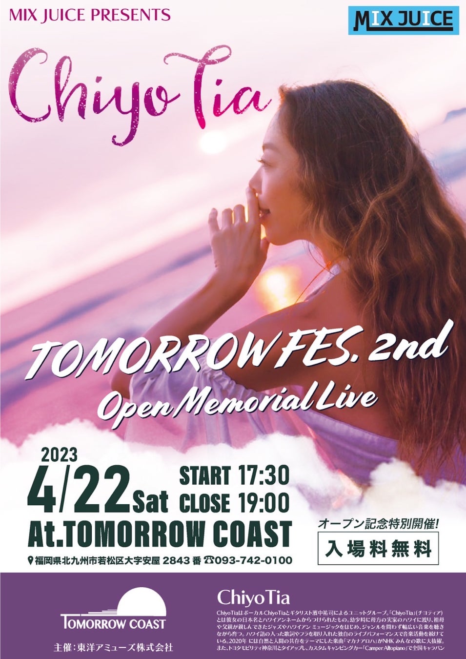 TOMORROW COASTのオープンを記念して2023年4月22日(土)に初となるイベントを開催します。第1部では若松区の郷土芸能「五平太ばやし」やK-pop・ヒップホップなど多彩なジャンルの地元ダンスチームが一挙集結して、ステージを盛り上げます。第2部では楽曲「マカナアロハ」が NHK みんなの歌にも使用された音楽ユニット「Chiyo Tia」が出演し、TOMORROW COASTの美しいサンセットにぴったりなハワイアンミュージックをお届けします。