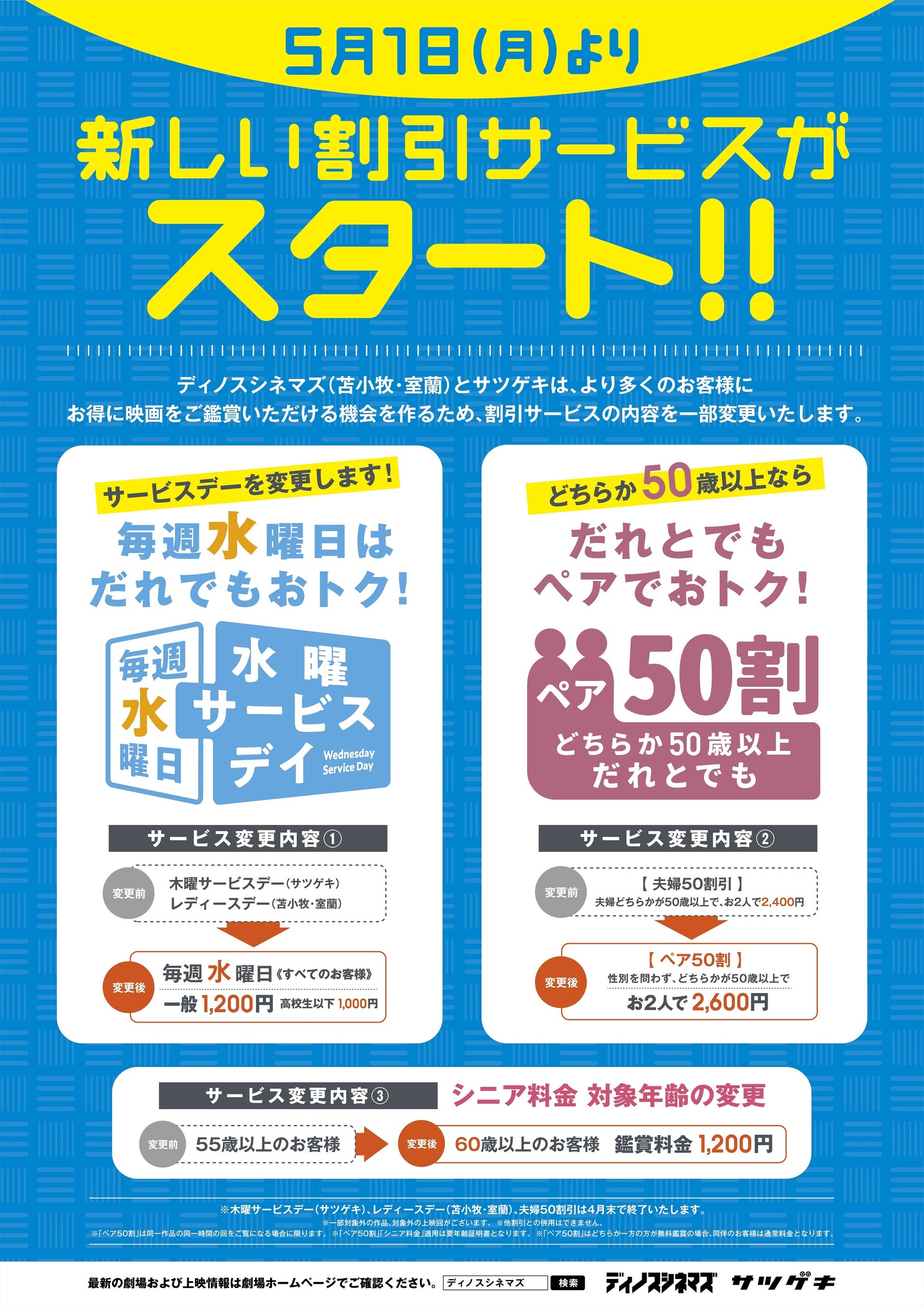 ※木曜サービスデー(サツゲキ)、レディースデー(苫小牧・室蘭)、夫婦50割引は4月末で終了いたします。
