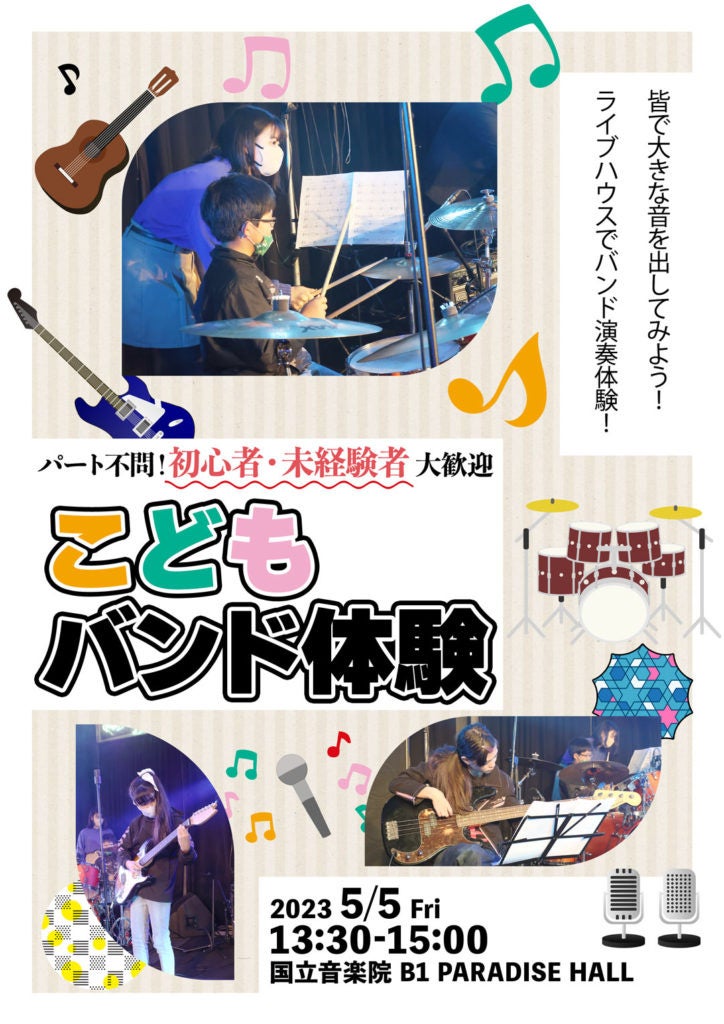 国立音楽院(住所:東京都世田谷区池尻 3-28-8)は、こどもの日に「沢山遊んで沢山学べるバンド体験会」を開催します。