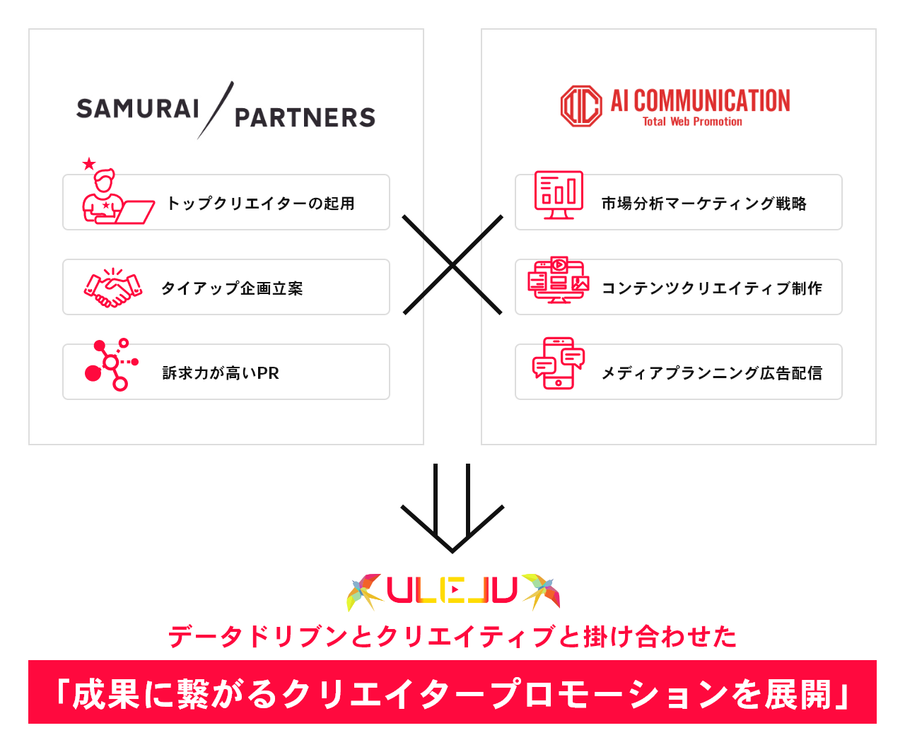 この度の業務提携により、「ULELU」のYouTuberマッチングサービスにおいてクライアントはサムライパートナーズが提携している100名超のトップクリエイターをプロモーションに起用することが可能となりました。単に有名なインフルエンサーを起用して情報を拡散するだけではなく、「ULELU」を展開するAIコミュニケーションが持つWEBマーケティング分野における知見と実効果にコミットする戦略設計により、データドリブンとクリエイティブを掛け合わせたクリエイタープロモーションを実現します。