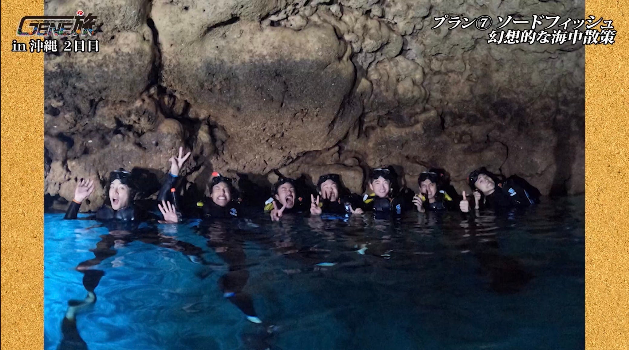 マリンアクティビティが体験できるお店のソードフィッシュに着くと7人は目的地の青の洞窟まで泳いで移動。青の洞窟には美しく神秘的な風景が広がり、その壮観さにGENEは大興奮。1番の絶景ポイントに行くとGENEは口を揃えて「青い!」と驚き、想像以上の景色に目を輝かせながら感動。神秘的な場所を見つけると7人で記念撮影も行った。幻想的な海中散策を終えて、裕太は「中学校の時からずっと行きたかったんですよ青の洞窟。やっと行けた!」と夢が叶ったことを告白。隼も「これは見た方がいい」と話し、亜嵐も「人生で1番綺麗な青色を見た気がする」と青の洞窟を絶賛していた。
