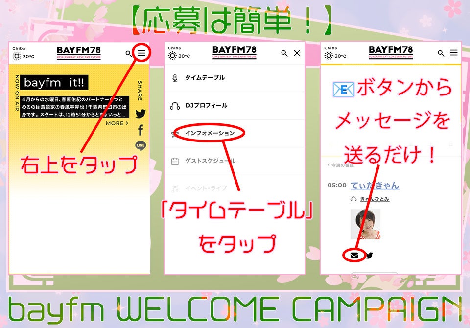 4月10日(月)〜4月16日(日)の期間中に、bayfmのラジオ番組宛にメールをお送りいただいたすべての方が対象!