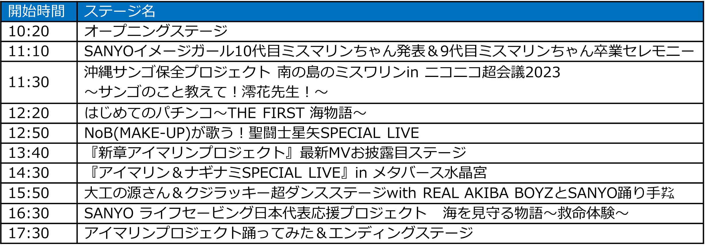 「SANYOブース」のスタートを飾るセレモニーでは、10代目のSANYOイメージガール「ミスマリンちゃん」を発表します。お披露目ステージでは、岡野陽一さんをゲストにお招きして、10代目ミスマリンちゃんに意気込みなどを語っていただくトークショーを行います。あわせて、9代目の桃衣香帆さん、御子柴かなさん、宮本りおさんも登場し、卒業セレモニーも行います。
