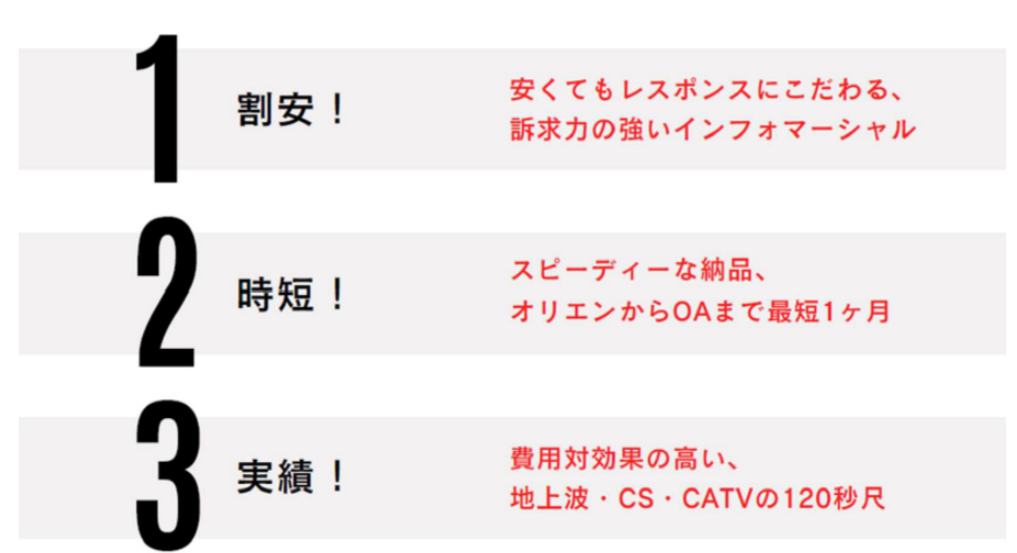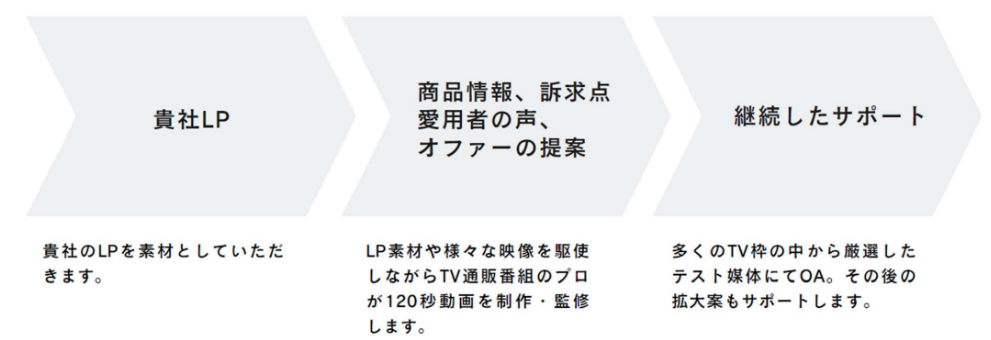 貴社のLPから120秒のインフォマーシャル動画を制作し、テレビでテストOA、そして継続して勝ち続けられるようサポート致します。