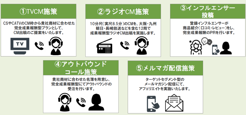 他にもインフルエンサー投稿やアウトバウンドコール、メルマガ配信などの通常アフィリエイトも取り扱いがあるため、幅広く提案が可能です。