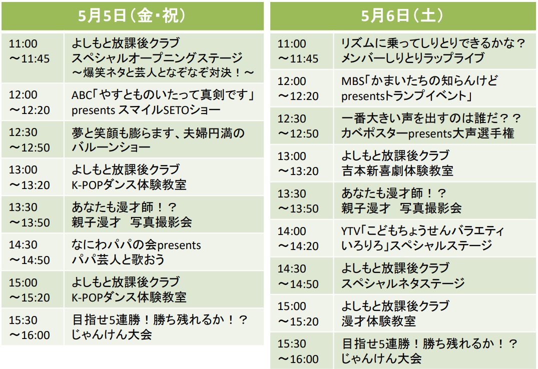 【ステージ】エリアでは、漫才や吉本新喜劇、K-POPダンスが当日体験・発表できる「よしもと放課後クラブ」ステージのほか、関西のテレビ局と連動したステージを実施することが決定しました。ABC「やすとものいたって真剣です」、MBS「かまいたちの知らんけど」、YTV「こどもちょうせんバラエティ いろりろ」といった、いつもテレビで見ている人気番組の企画を楽しむことができます。また、漫才の体験ができる「あなたも漫才師!? 親子漫才 写真撮影会」など、みんなで楽しめるステージが盛りだくさんです。