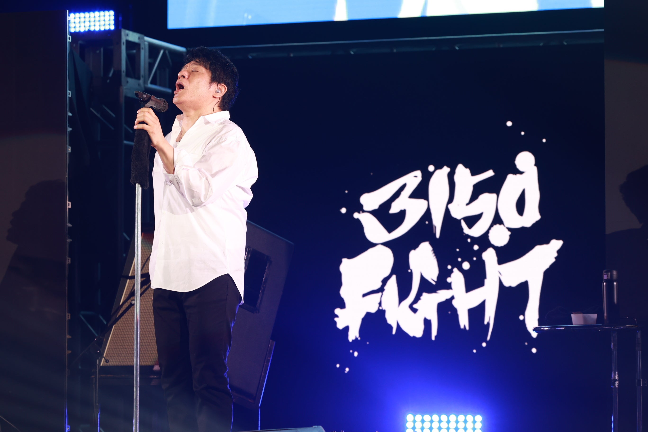 1曲目は、亀田興毅ファウンダーも現役時代に励まされたというCHAGE and ASKA「PRIDE」を披露。2曲目にはボクサー達に向けた応援歌ともいえる「太陽と埃の中で」、そして最後には代表曲「YAH YAH YAH」を熱唱した。