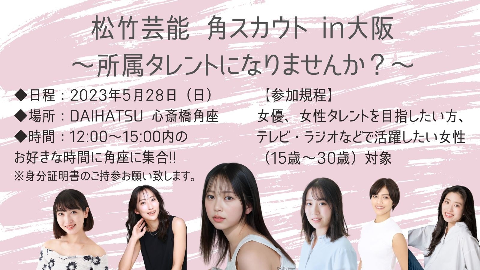 松竹芸能の劇場「DAIHATSU 心斎橋角座」にて、5月28日(日)にスカウトイベントを開催致します。