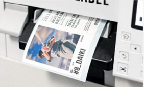 自社のコンテンツ素材やその場で撮影した写真を専用のシステムにアップロードすることで、簡単にラベル制作が可能です。出力されるラベルには、日時・場所、タイトルなどのテキスト入力が可能です。