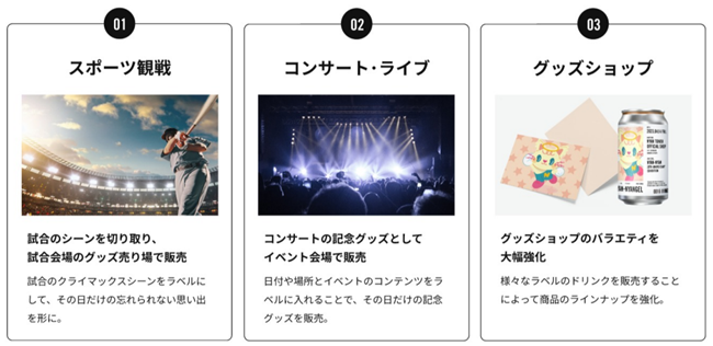 本サービスは、専用のラベルシステムとラベルプリンター、ドリンクが一体となったソリューションを提供することで、その場で簡単にオリジナルラベルドリンクを作成することが可能で、イベント・音楽ライブ会場などのシーンで手軽に導入が可能です。