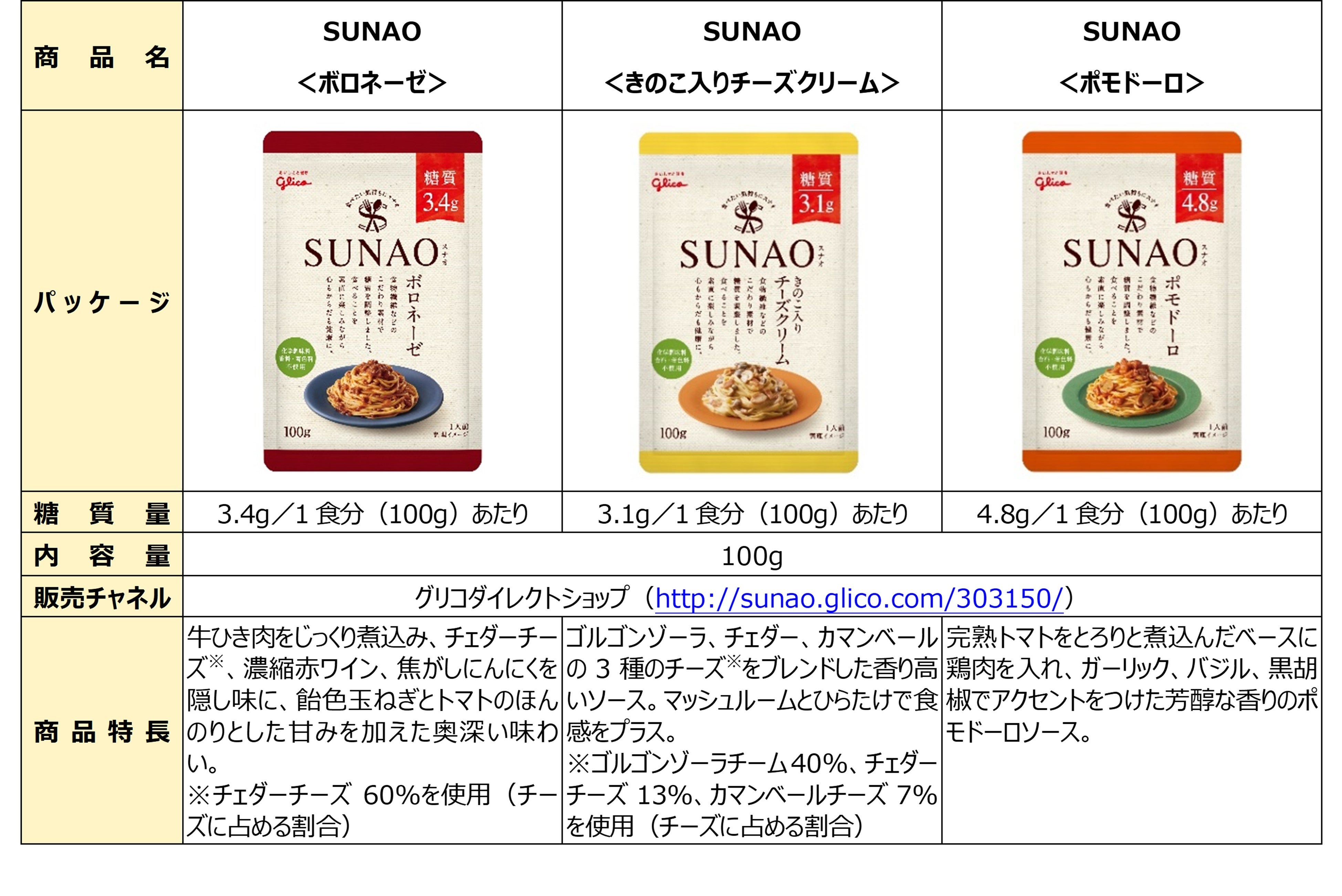 「おいしくて、カラダにもやさしい。おいしさを楽しむことと、健康を両立することはできないだろうか。」Glicoのブランド「SUNAO」は、そんな願いを叶えたいという思いから生まれました。SUNAOが目指すのは、すべての人が食べることを楽しみ、ココロもカラダもずっと健康でいられる社会です。そこで、着目したのは「適正糖質」。間食は糖質量10g以下、食事は糖質量20~40gに、食物繊維などのこだわり素材で糖質を控えました。 2017 年 2 月にアイスシリーズから発売を開始し、現在はビスケットやパスタにも分野を広げて展開しています。これからもおいしい適正糖質のスイーツや食品を通して、健康と食べる喜びを提供していきます。