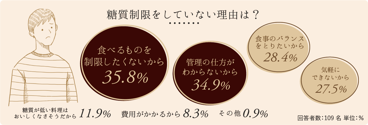 糖質制限をしていない理由としては、「食べるものを制限したくないから(35.8%)」「管理の仕方がわからないから(34.9%)」などが上位に挙がり、「糖質が気になっても糖質制限には踏み出せない」という葛藤が伺えます。【図6】