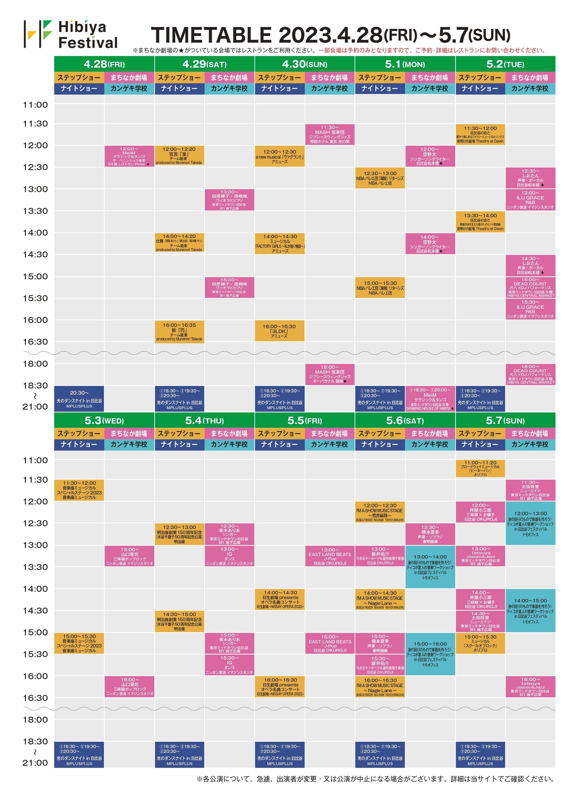 | <<4/20(木)14時~ 「ステップショー」前方席&カンゲキ学校予約受付開始>> 本日4/20(木)14時~ステップショー演目の前方席&カンゲキ学校の事前予約受付を開始いたします。 以下URL内、「観覧についてのご案内」部分にございます、事前予約はこちらからよりご予約いただけます。 URL:https://www.hibiya.tokyo-midtown.com/hibiya-festival/ ※「ステップショー」は、事前予約席以外に、当日入場可能な自由観覧席もご用意がございます |