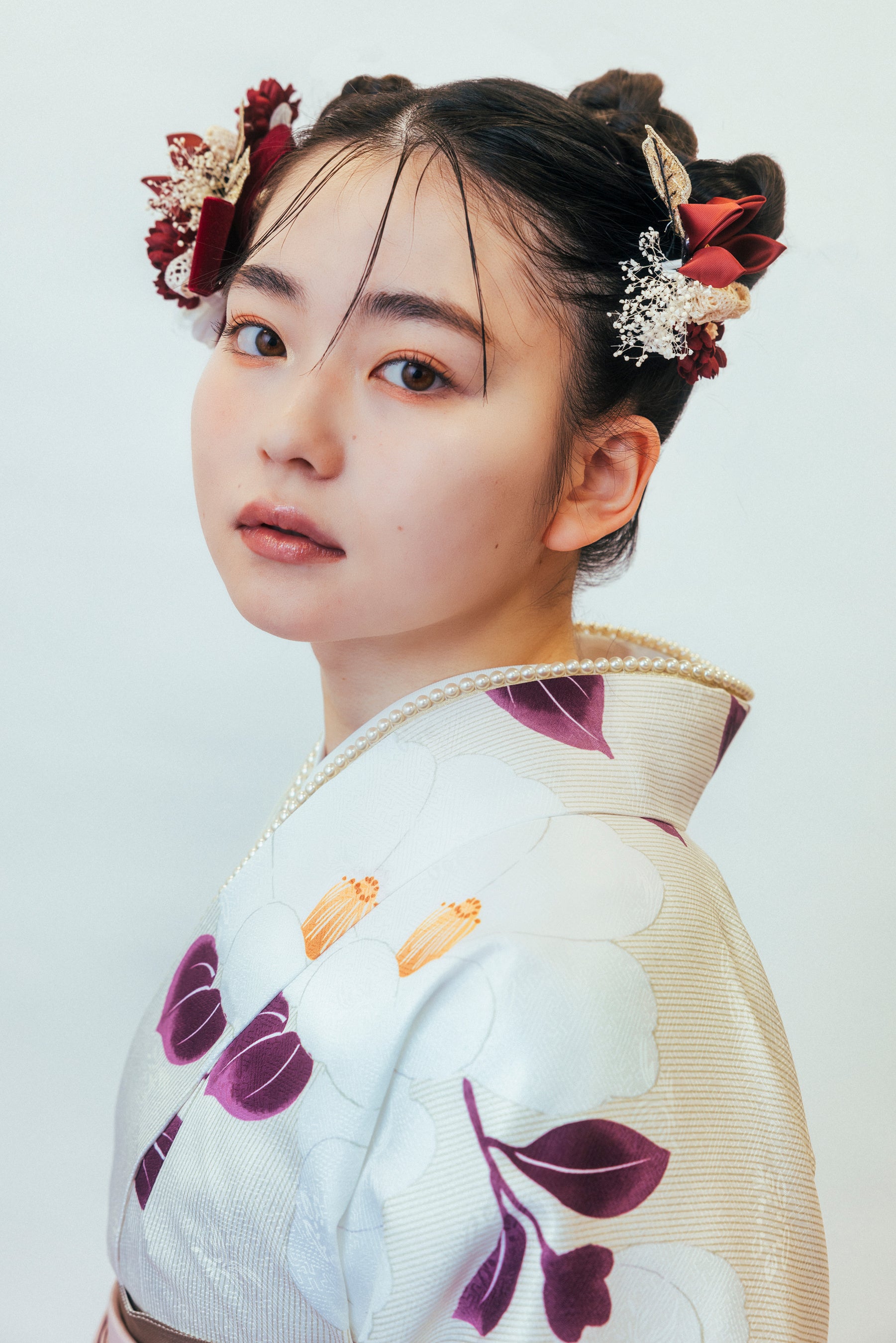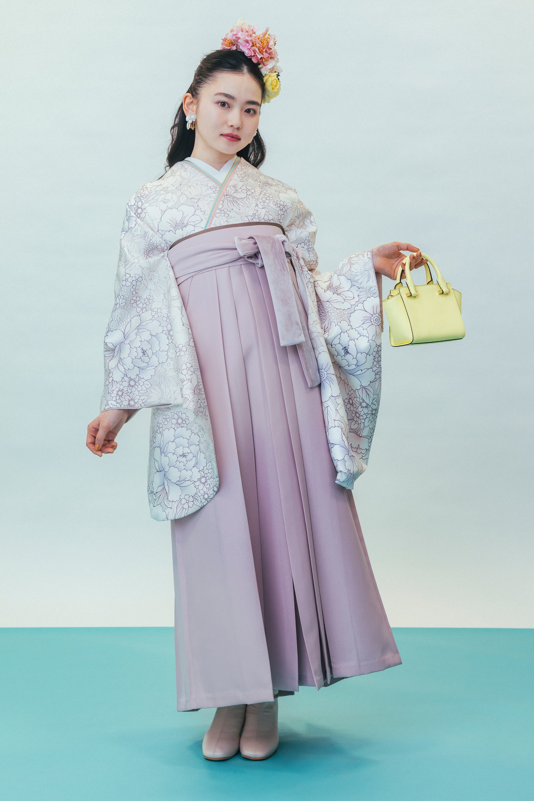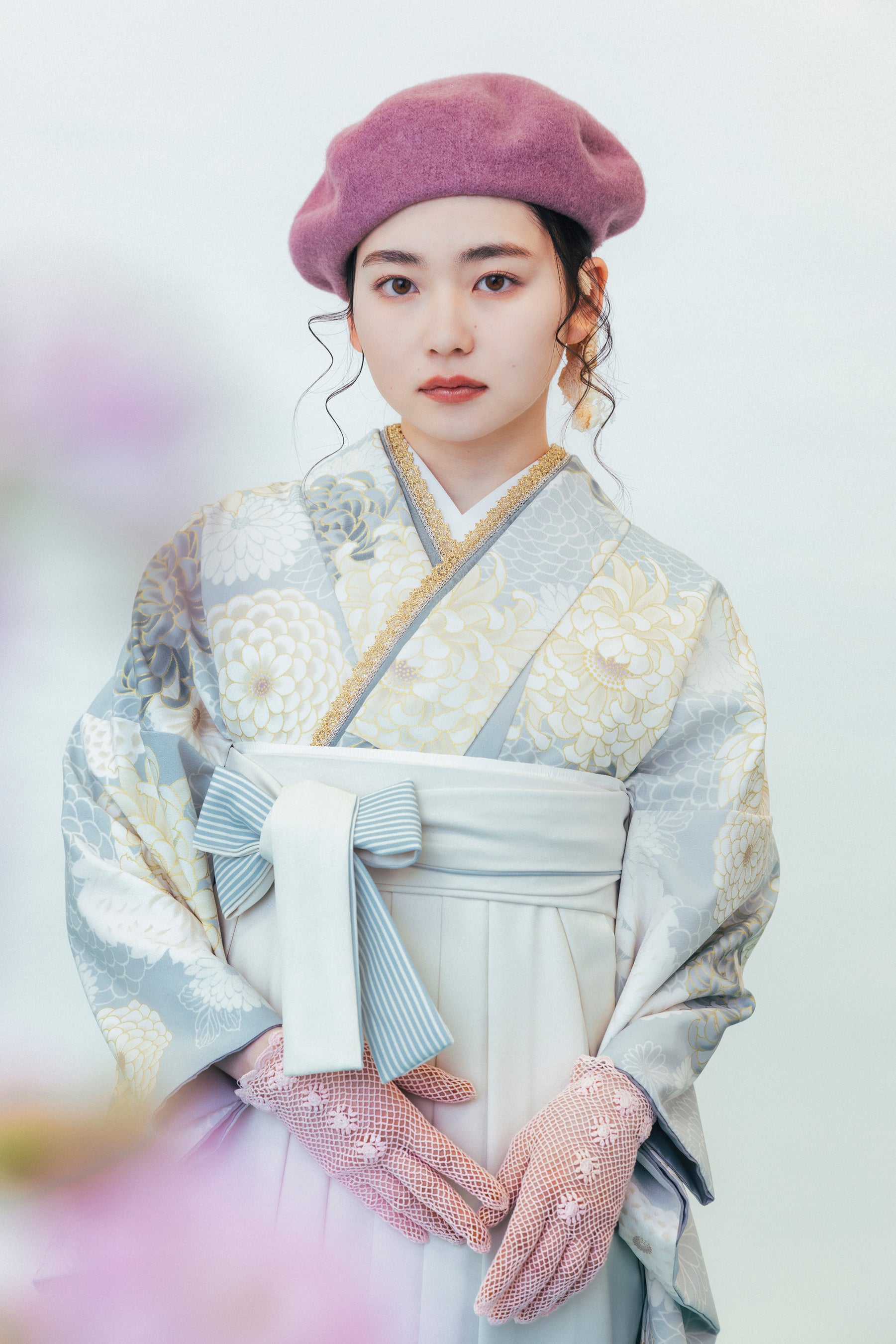 学生最後の特別な日は、華やかに彩った最高の衣装を着ていただきたいという思いを込めた、京都きもの友禅の新作袴を山田杏奈さんが可憐に着こなします。近年人気のナチュラルで淡いテイストの袴をやわらかいトーンでまとめたコーディネートで、トレンド感のある仕上がりになっています。新たに5種類の袴が追加され、カラー展開もより豊富になり、コーディネートの幅も広がりました。また、和装の古典的な型にとらわれず、洋服のようにお好みに合わせて自由にスタイリングしていただけるよう、様々な小物を取り入れたアレンジも紹介しています。レース手袋やベレー帽など、取り入れやすいアイテムを使ったワンランク上の最旬スタイルも合わせて、ぜひご覧ください。