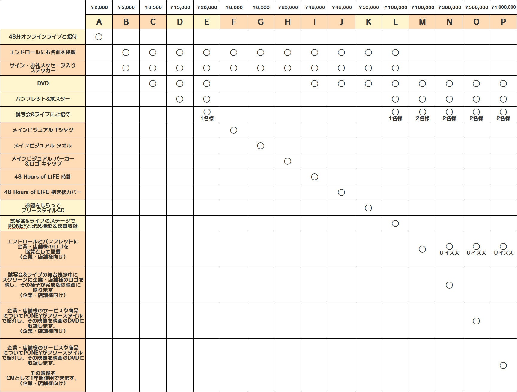 エンドロールへのお名前の記載、メインビジュアルTシャツ、試写会へのご招待、企業・店舗様向けの協賛ロゴの掲載など様々なリターン内容をご用意しています。