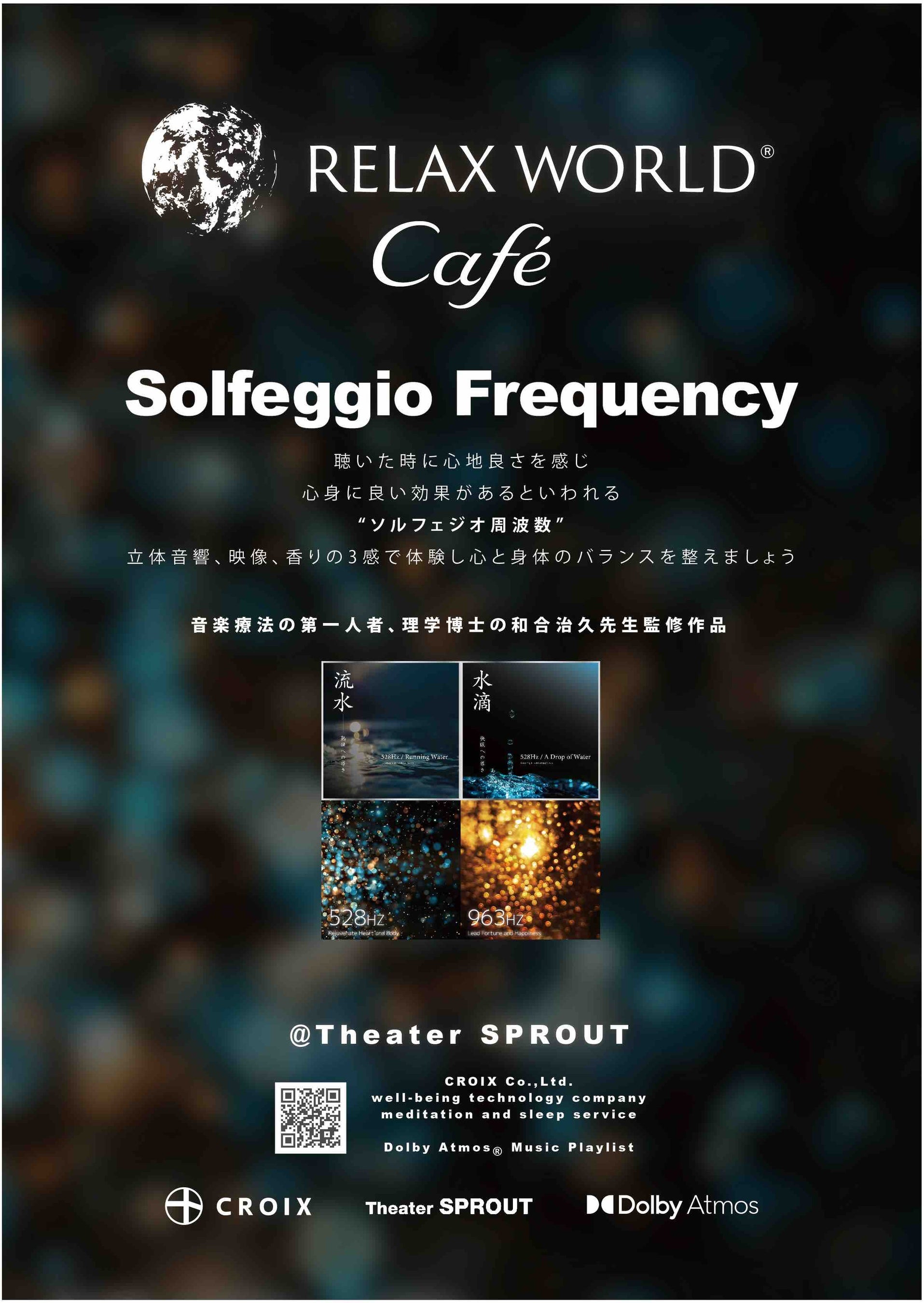ウェルビーイング・テクノロジー事業を行う株式会社社クロア(本社:東京都目黒区、代表取締役社長:戸部田 馬準)は、浅草と上野の中間に位置する問屋街「かっぱ橋道具街」にあるカフェ「sensing touch of earth」の2階にある、7.1.4ch ドルビーアトモスの世界最先端サラウンドを体験できるレンタルシアター「Theater SPROUT」にて、カフェご利用のお客様に癒やしの音楽を立体音響で体験して頂く「RELAX WORLD Café」企画を2022年秋より展開し各方面から好評を頂きました。新たなアプローチによる継続企画として、ヒーリングサウンドを立体音響で感じるひとときを、より効果的に感じる場として美しい自然映像、フローラルウッドの香りによるアロマ効果を加え、音、映像、香りの3感による癒やしのカフェタイムをご提供致します。定期的に様々な企画更新も行われ、第1弾の音楽は、音楽療法の第一人者、理学博士の和合治久先生監修による聴いた時に心地良さを感じ、心身に良い効果があるといわれるソルフェジオ周波数作品を体験頂きます。音楽配信サービスのApple Music、Amazon Musicにて「RELAX WORLD Café」で使われている楽曲を含むDolby AtmosミックスによるヒーリングミュージックのMusic Playlistも公開中。