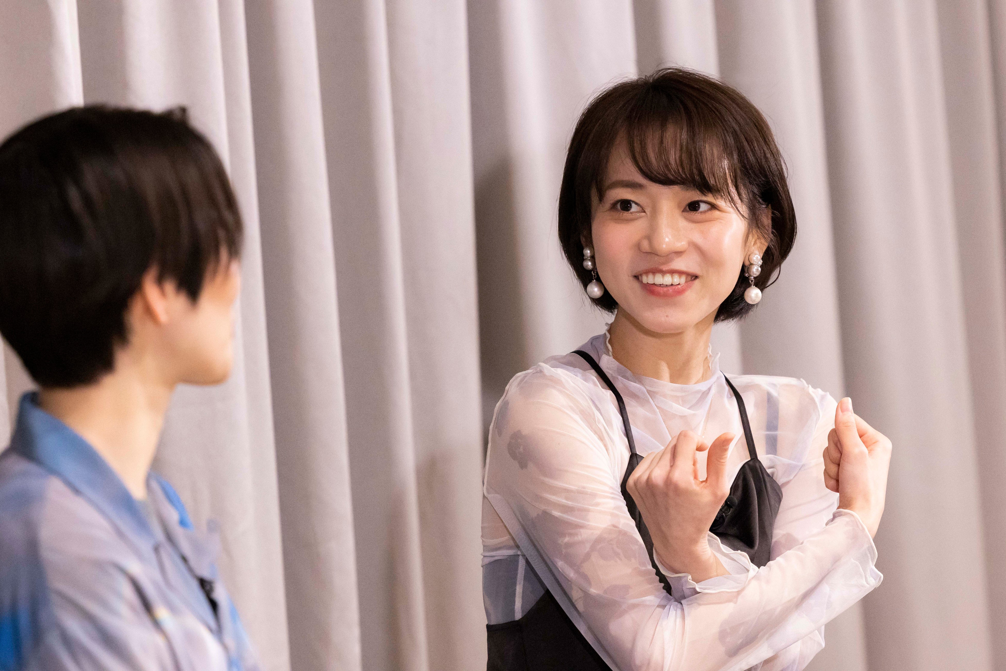 大勢の観客の拍手に迎えられた七海は「わたしにとっても思い入れのある作品なので、すごくうれしいなと思っています」とあいさつ。真彩も「退団してから、ひろきさんと一緒にお仕事をさせていただけるなんて。しかも『燃ゆる風』の副音声収録だなんて」と感激の表情を見せた。そしてあらためて「真彩希帆さんのカッコいいエピソードがいっぱいあるので。今日はそこもしっかりと伝えたい」と決意表明をする七海に、「なんですかそれー!」と笑った真彩。仲のいい二人の軽妙なやり取りで、収録が始まった。
