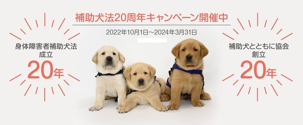 身体障害者補助犬法が成立して20年経つ現在でも補助犬(盲導犬、介助犬、聴導犬)や補助犬法の認知度は低く、補助犬の実働数が増えない、補助犬の同伴拒否が後を絶たないなどの社会問題の原因になっています。日本補助犬協会では2022年~2023年にかけ「補助犬法20周年キャンペーン」を開催し、誰もが補助犬を知る、応援する、受け入れる社会の実現を目指し様々な取り組みにチャレンジしていきます︕