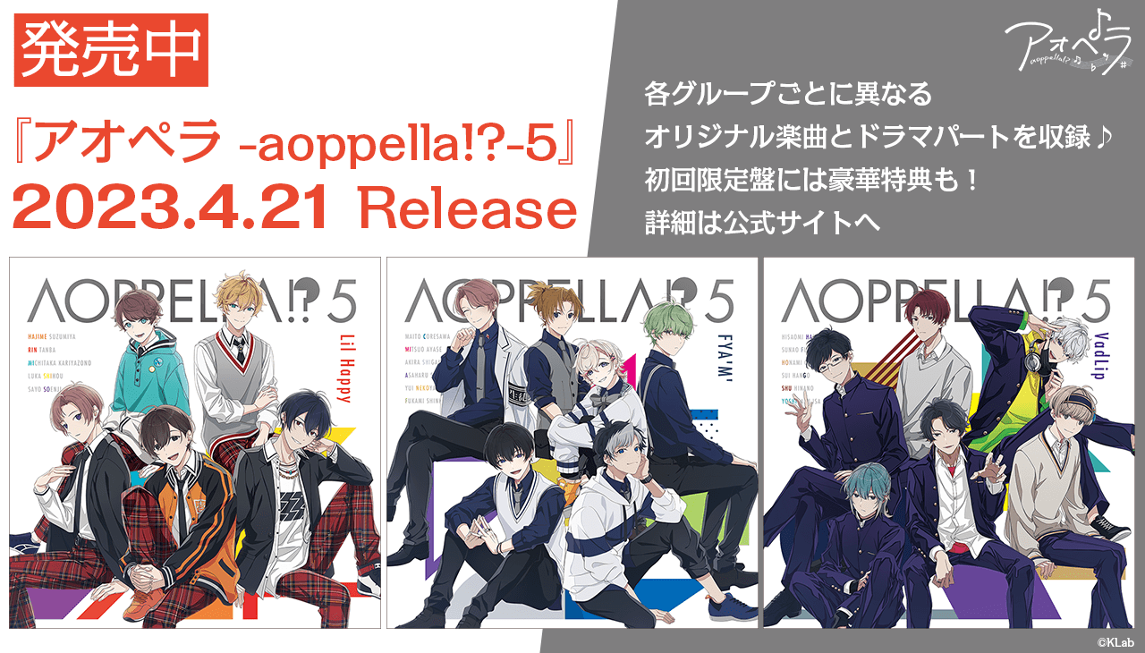 4月21日(金)にプロジェクト5枚目のCD「アオペラ -aoppella!?-5」が、発売されました。今回発売される「アオペラ -aoppella!?-5」は、リルハピ、FYA’M’、新グループVadLipのグループ毎に仕様が異なり、それぞれのデザインジャケット、オリジナル楽曲とドラマパートが収録されています。