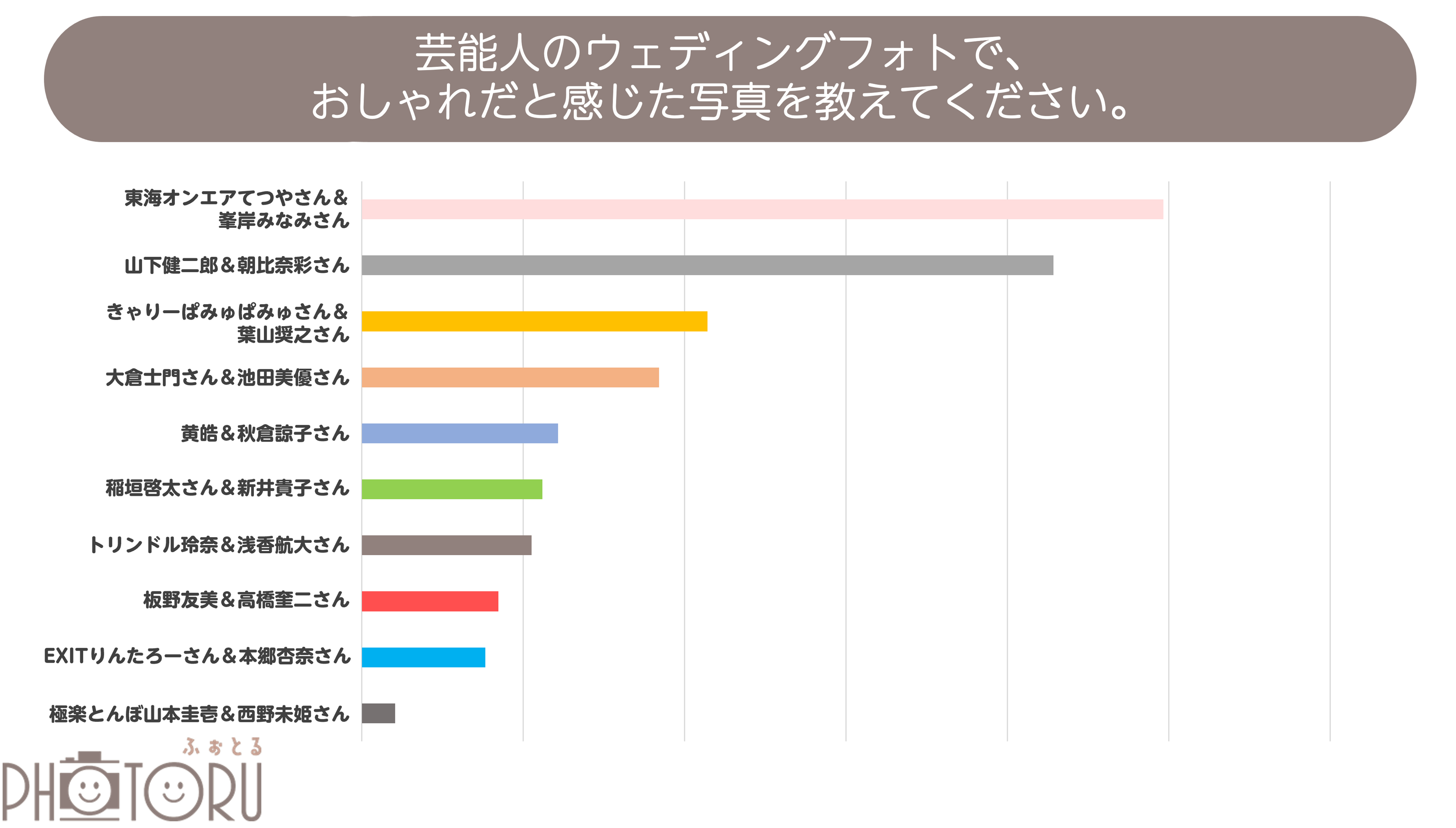 2022年1月~2023年3月に公表された芸能人のウエディングフォトの中で最も人気を集めたのは、「東海オンエアてつやさん&峯岸みなみさん」のウエディングフォトでした。次いで「山下健二郎&朝比奈彩さん」「きゃりーぱみゅぱみゅさん&葉山奨之さん」「大倉士門さん&池田美優さん」という結果になりました。