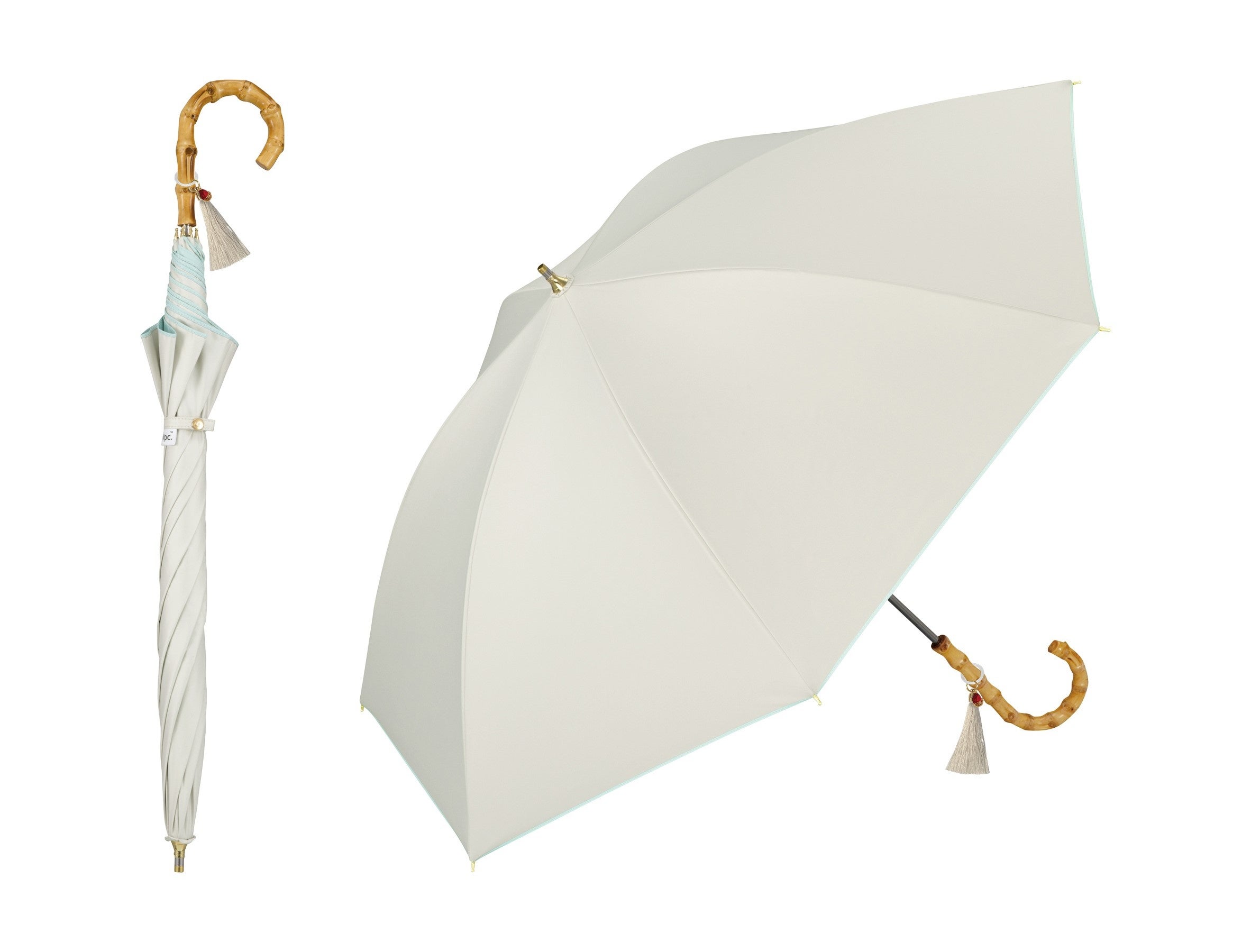 オフホワイトのワンカラーに見える傘ですが、実は内側に爽やかなミントブルーを使ったバイカラーのデザイン。意外性のあるインサイドカラーは、秘密を隠して暮らすキャラクターをモチーフにしたものです。