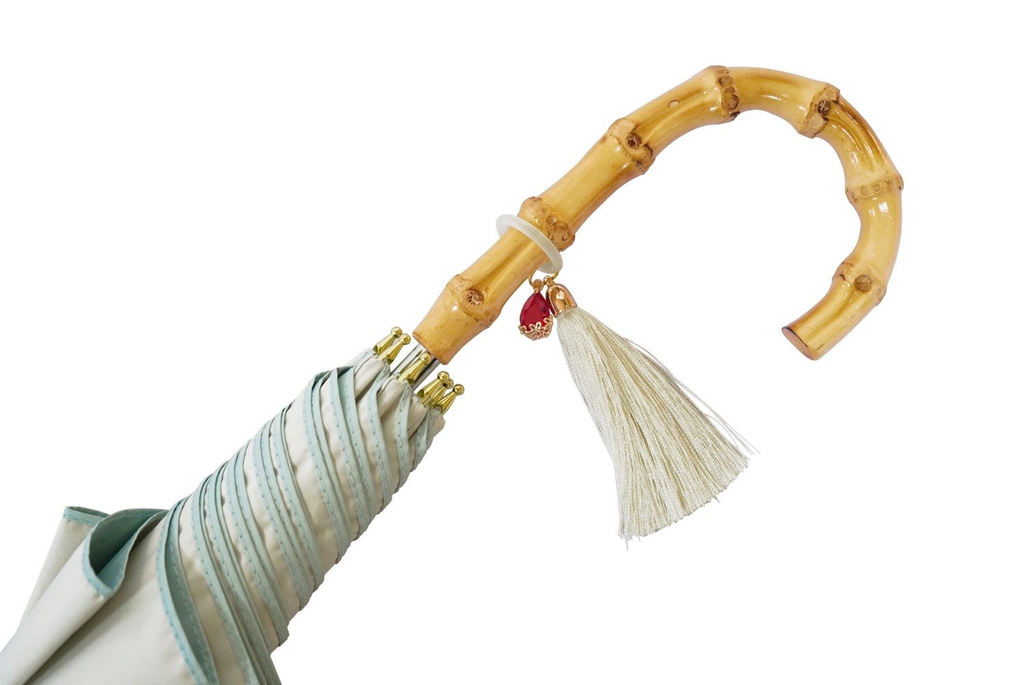 スタイリッシュなバンブーハンドルには、吸血鬼にちなんで“血”の色をイメージした赤いストーンチャームと、印象的な手元を演出するタッセルをプラス。チャームとタッセルはシリコンリングで取り付けてあるため、簡単&便利に取り外し可能です。
