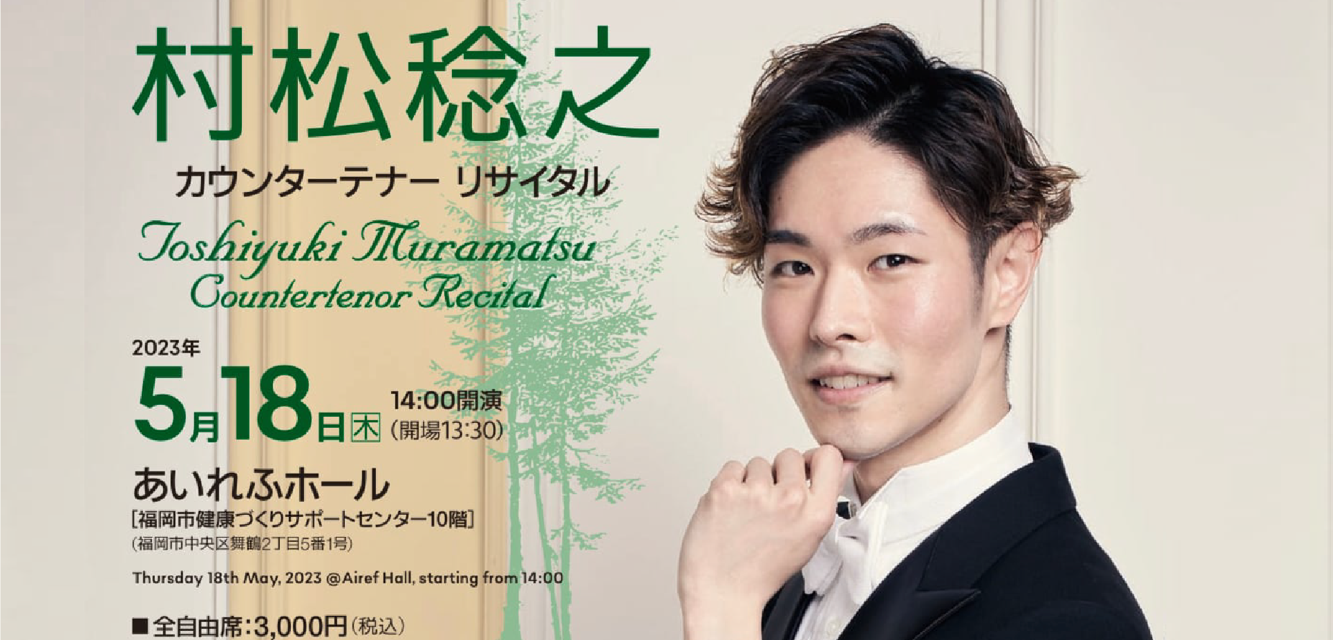 カウンターテナーとは、バリトンやテノールの音域を持つ歌手が”裏声”で、歌うことが一般的ですが、歌手の村松さんは”天然”のカウンターテナーの音域を持っているようです。世界で2人しかいないとされており、東京でのコンサートはSOLD OUTになるほど人気とのことです。初、福岡でリサイタルを開催致します。