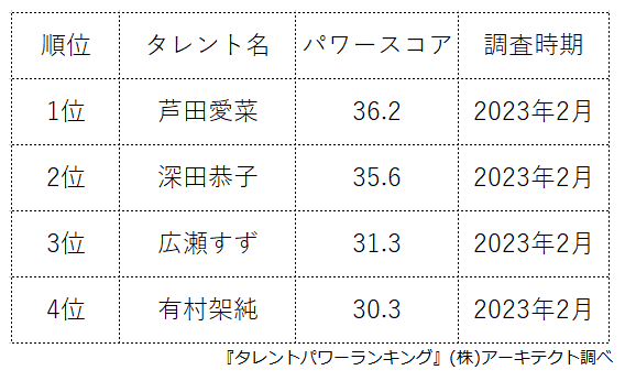 本ランキングは、2023年2月度に実施したタレント調査データ(一部過去実施データ)を利用し、タイトルに応じてランキング形式でまとめたものです。