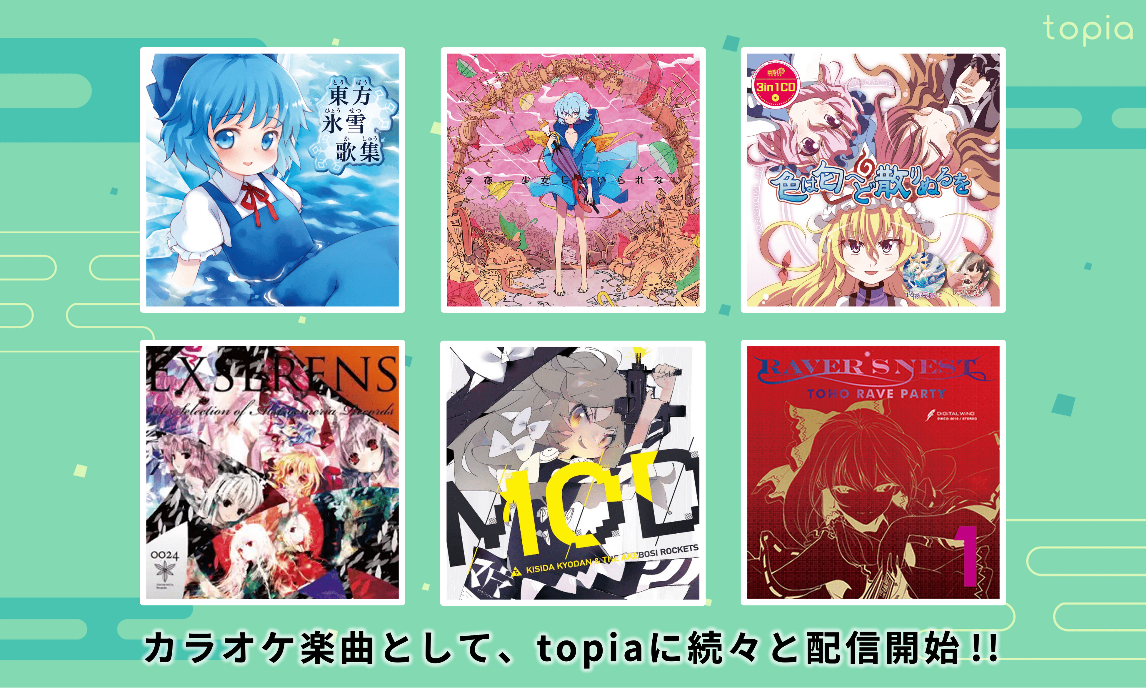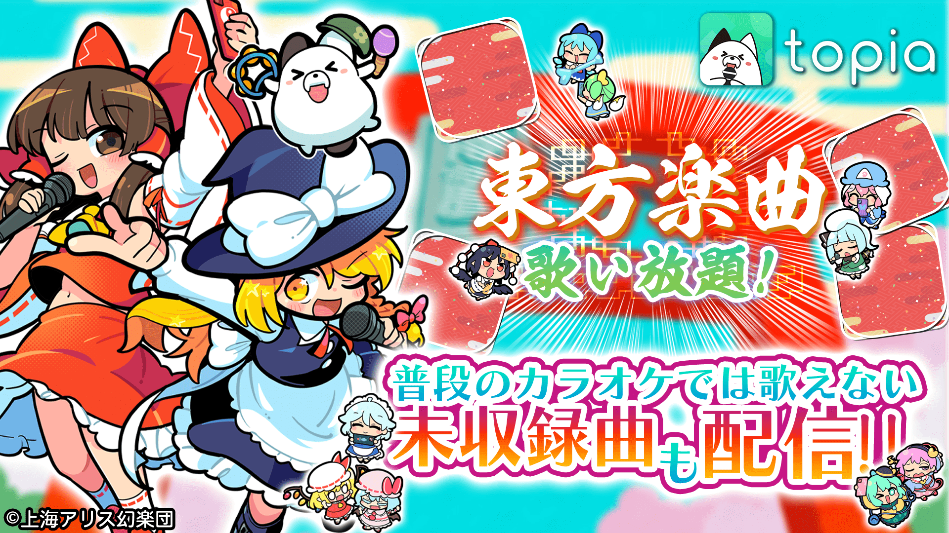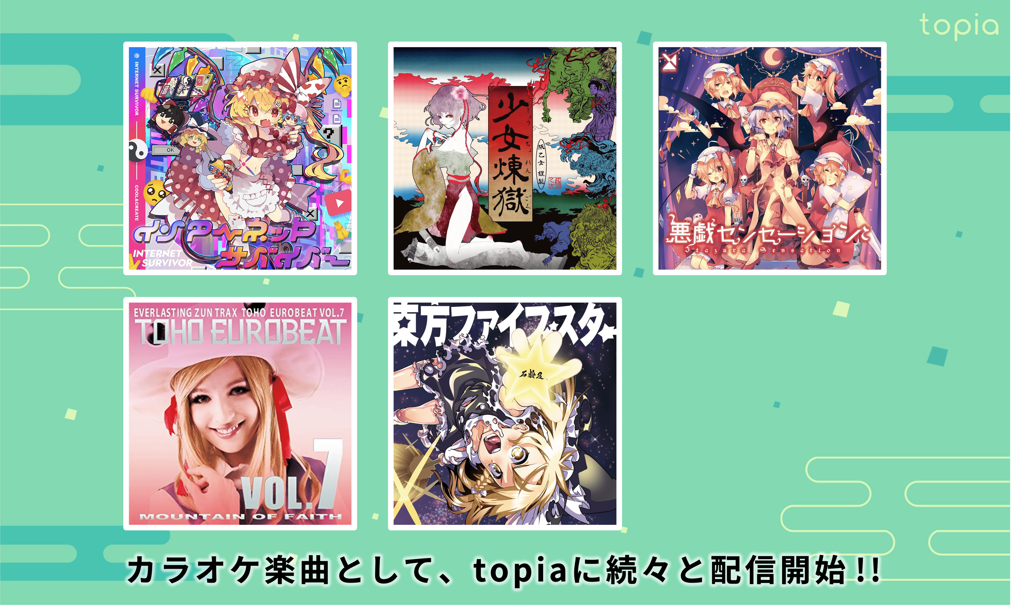 自分だけのアバターをつくってカラオケやライブ配信ができるスマホアプリ「topia」のカラオケ機能にて、「東方同人音楽流通(※1)」がオンラインでの配信や販売を行っている東方アレンジ楽曲(※2)を配信開始いたします。