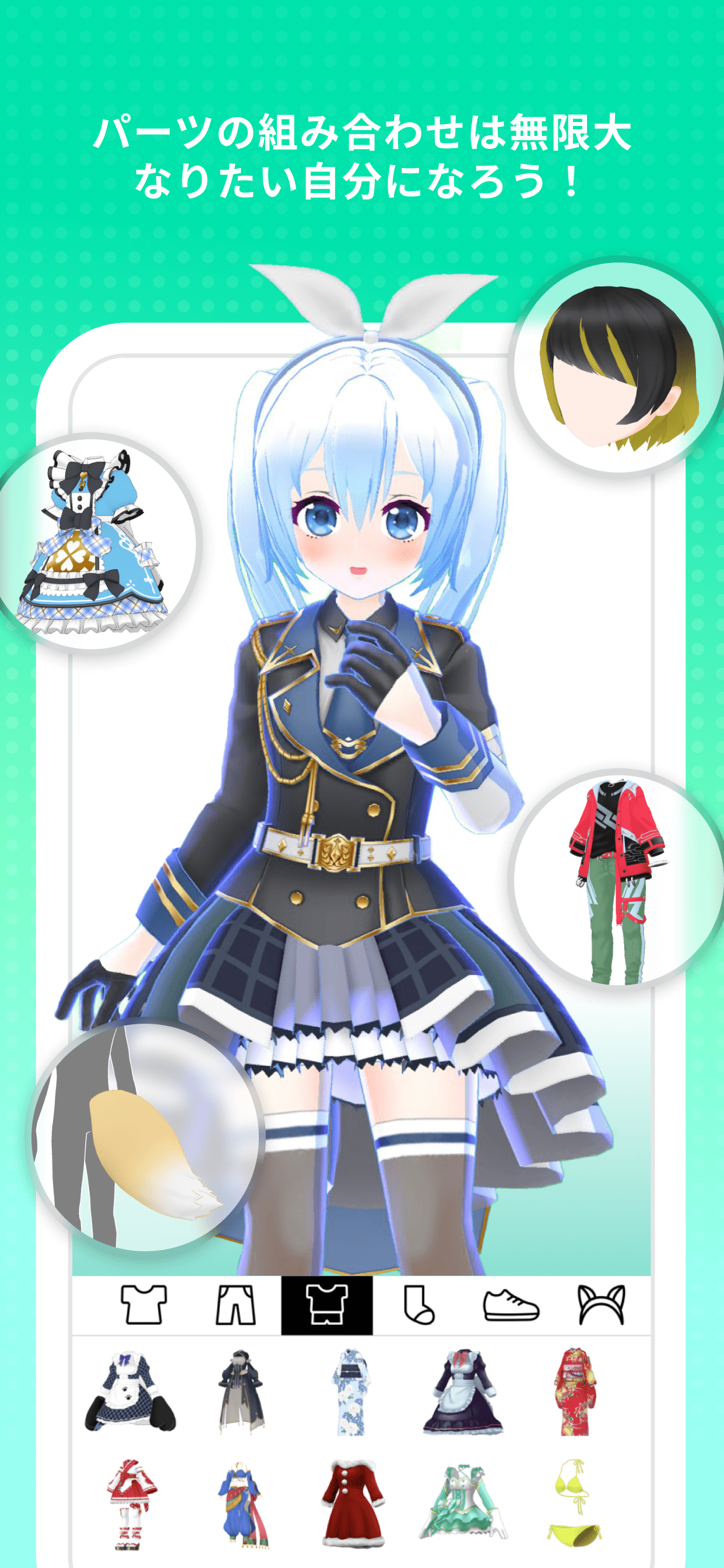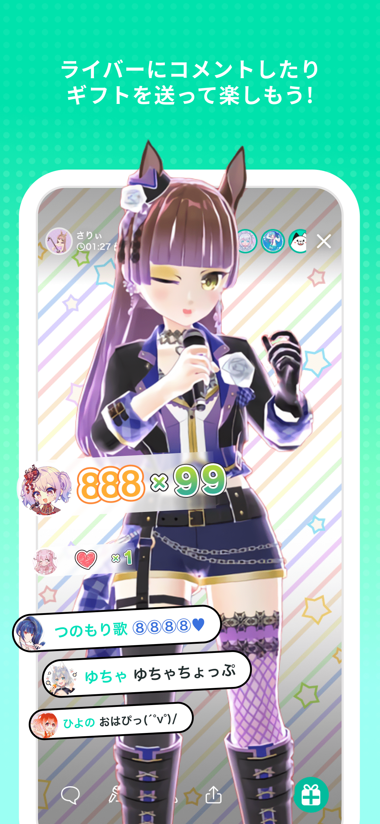 自分だけのアバターをつくってカラオケやライブ配信ができる、バーチャルカラオケ配信プラットフォームです。人気曲を中心に2万曲のカラオケが歌い放題で楽しめます。