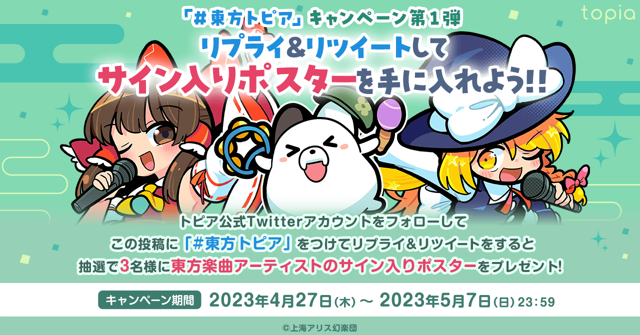 東方アレンジ楽曲のカラオケ配信を記念して、下記のtopia公式Twitterアカウント(@topia_pr)をフォローし、そのアカウントから投稿されたキャンペーンツイートに「#東方トピア」のハッシュタグをつけてリプライすると、抽選で3名様に東方音楽サークルのサイン入りポスターをプレゼントいたします。