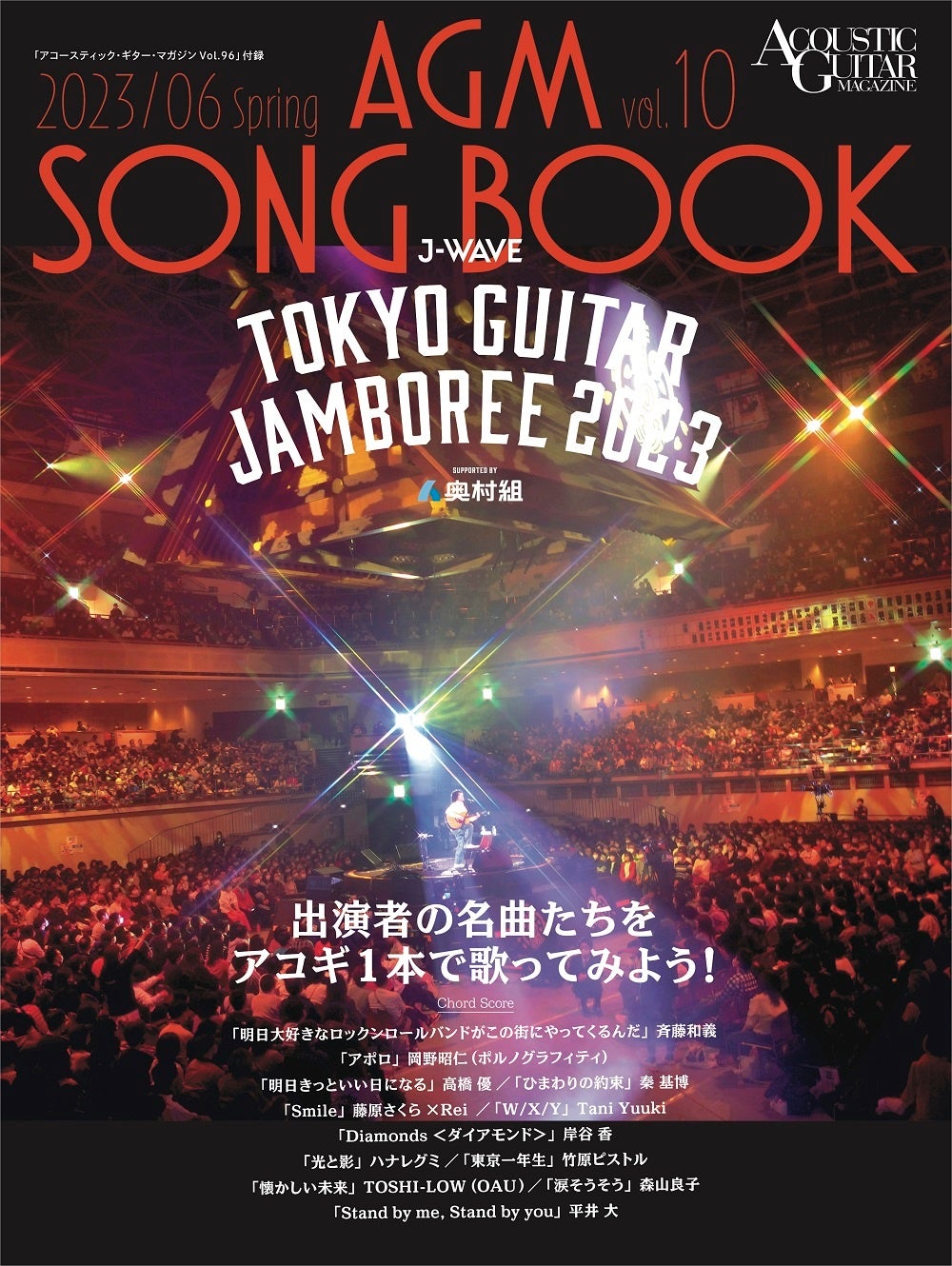 好評の付録小冊子『AGM SONB BOOK Vol.10』は、2023年3月4日、3月5日に両国国技館で行なわれた『J-WAVE TOKYO GUITAR JAMBOREE 2023 supported by奥村組』とのコラボ企画。斉藤和義の新曲「明日大好きなロックンロールバンドがこの街にやってくるんだ」、珍しくソロの弾き語りで登場した岡野昭仁(ポルノグラフィティ)による「アポロ」、懐かしさ満載で会場を大いに盛り上げた岸谷 香の「Diamonds <ダイアモンド>」など、イベントのハイライトとなった12曲を厳選し、アコギ1本で歌えるように歌詞とコード譜をダイアグラム付きで掲載。出演者18名による豪華ギター・ジャラリーも必見です。