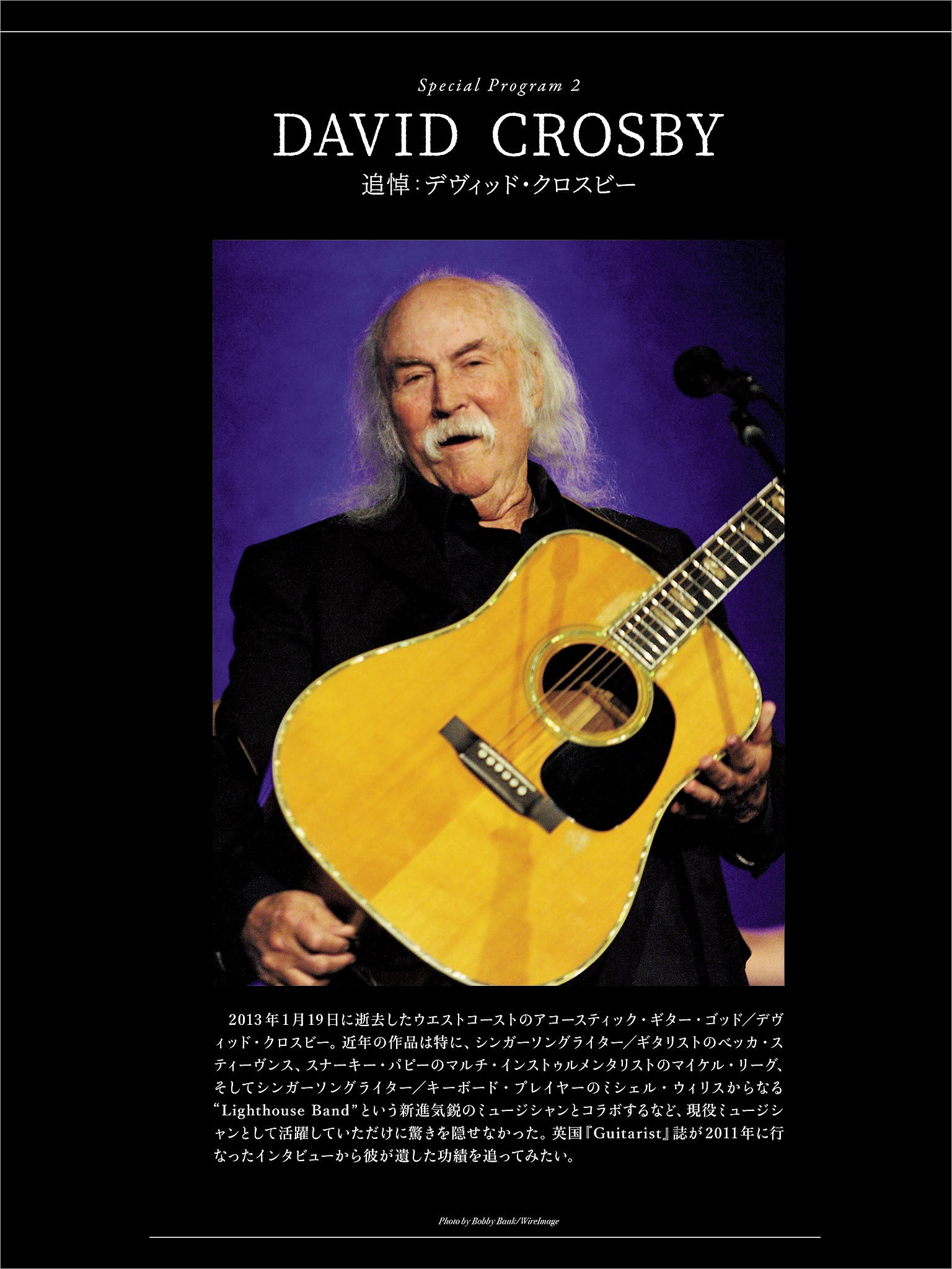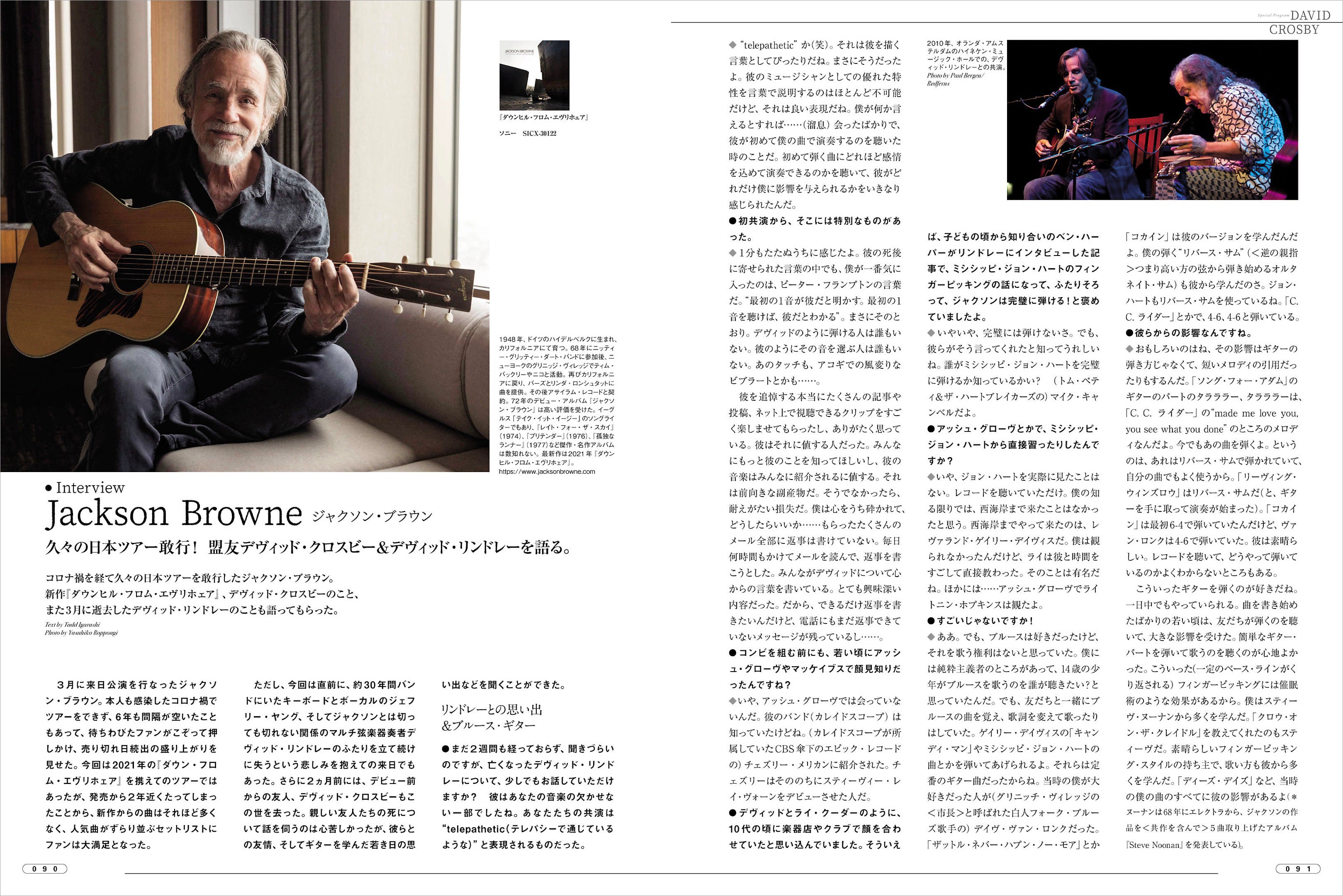 第2特集では、2013年1月19日に逝去したウエストコーストのアコースティック・ギター・ゴッド/デヴィッド・クロスビーの追悼記事を掲載。近年の作品は特に、シンガーソングライター/ギタリストのベッカ・スティーヴンス、スナーキー・パピーのマルチ・インストゥルメンタリストのマイケル・リーグ、そしてシンガーソングライター/キーボード・プレイヤーのミシェル・ウィリスからなる”Lighthouse Band”という新進気鋭のミュージシャンとコラボするなど、現役ミュージシャンとして活躍していただけに、その訃報に驚きを隠せなかった音楽ファンも多かったことでしょう。晩年の活動を語った貴重な本人インタビューのほか、1960年代後半からローレル・キャニオンの地で生活をともにした盟友ジャクソン・ブラウンの最新インタビューも。また、ジャクソンは、今年3月に亡くなった盟友デヴィッド・リンドレーとの思い出も存分に語ってくれています。